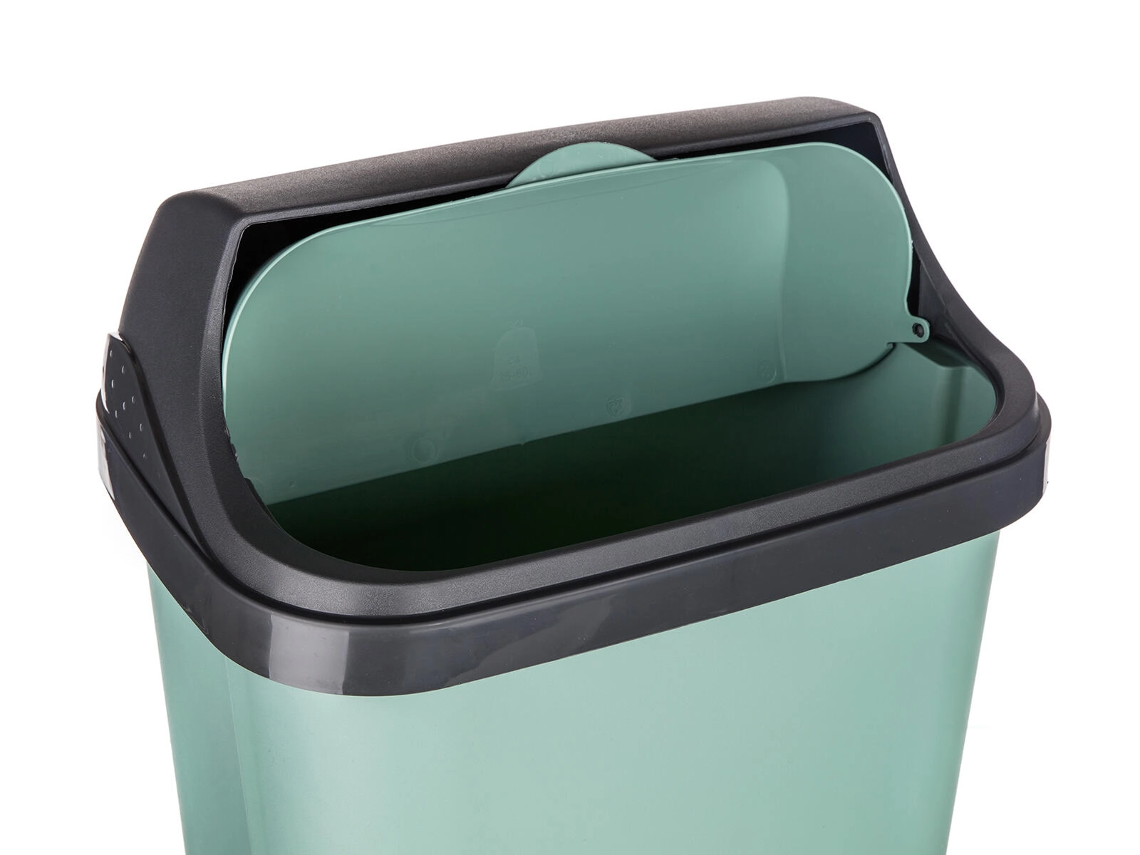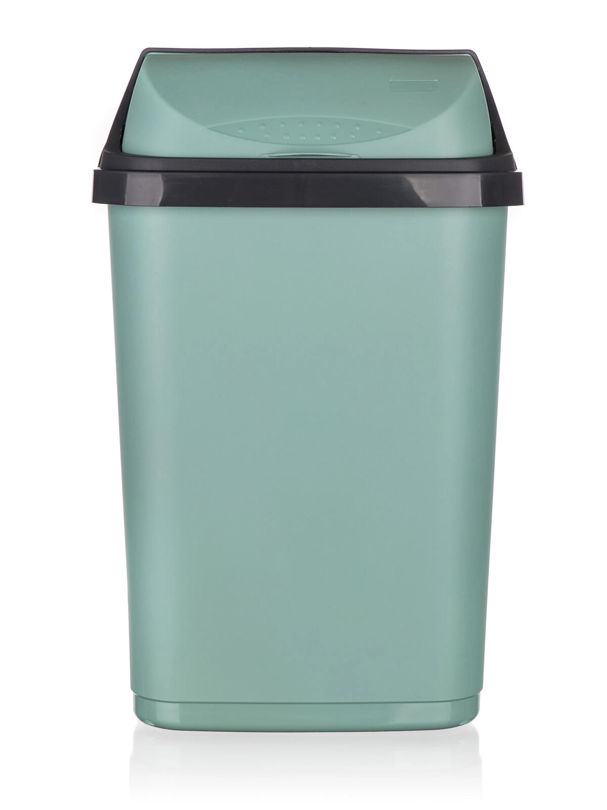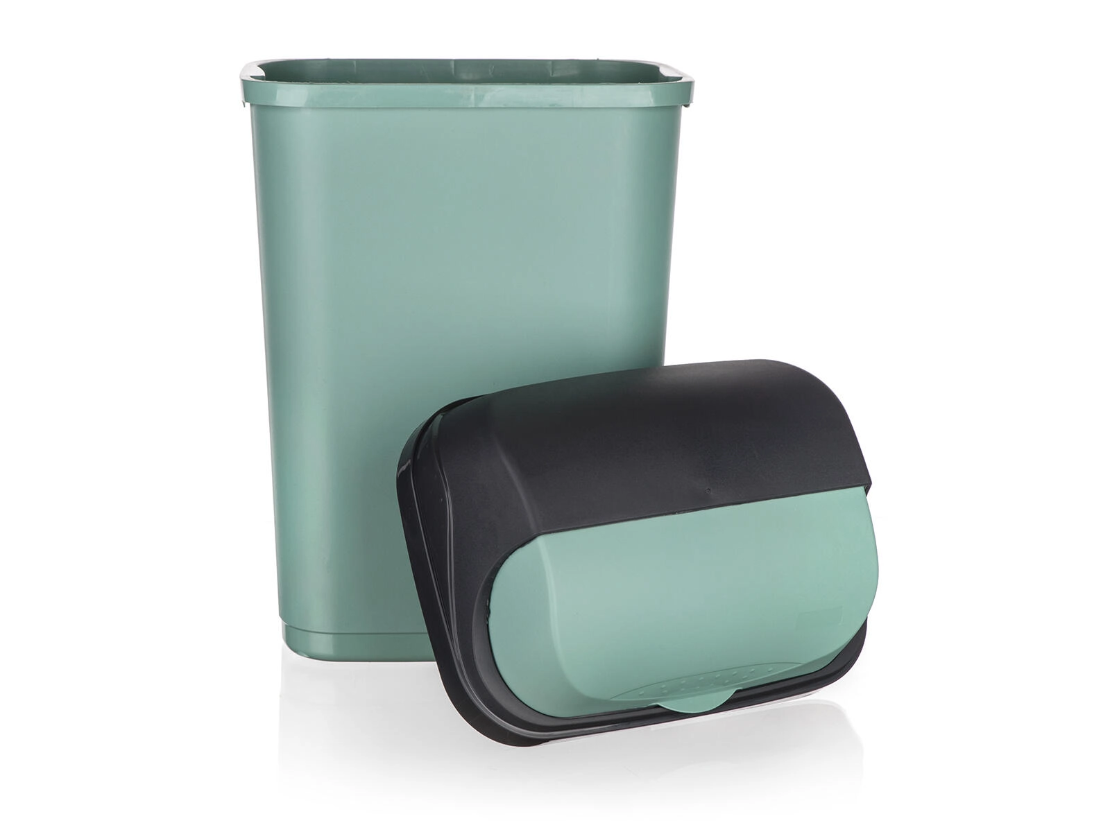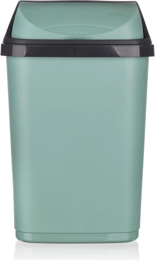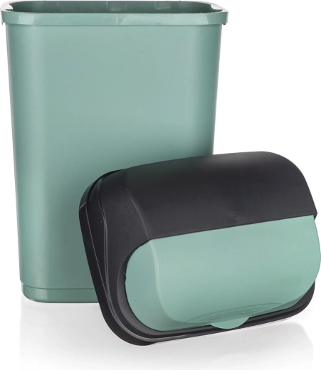 Der Eimer verfügt über ein abnehmbares Oberteil für leichtes Entnehmen und Wechseln des Beutels sowie einen Schiebedeckel für komfortable und saubere Nutzung. Die glatte Kunststoffoberfläche ist pflegeleicht und die grüne Ausführung fügt sich stilvoll in moderne Interieurs ein.