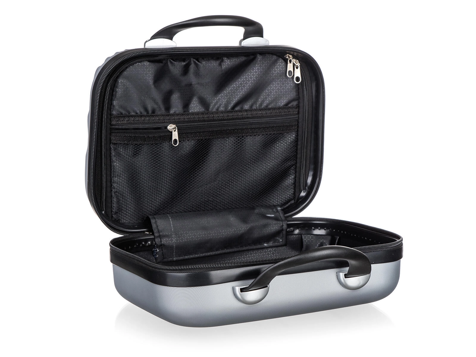 Das Innere bietet eine Stoff-Trennwand mit Reißverschluss und eine Netztasche für die übersichtliche Aufbewahrung von Kosmetik, Elektronik oder kleinen Accessoires. Doppelte Reißverschluss-Schieber ermöglichen ein schnelles Öffnen und sicheres Schließen, während robuste Griffe für angenehmes Tragen sorgen.