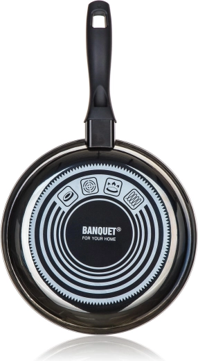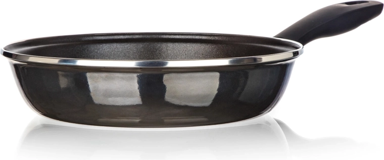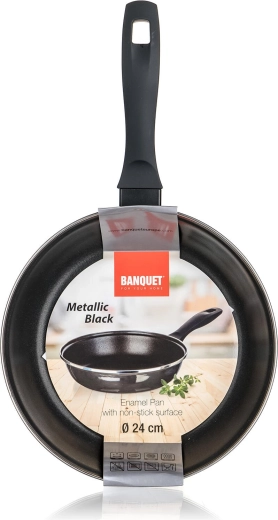 Elegante Pfanne mit 24 cm Durchmesser in Metallic Black mit einer robusten dreischichtigen Antihaftbeschichtung PPG QuanTanium für gesünderes Kochen mit minimalem Öl. Die äußere emaillierte Oberfläche erhöht die Widerstandsfähigkeit und erleichtert die Pflege, während der ergonomische Bakelitgriff mit Soft-Touch-Oberfläche einen sicheren und bequemen Halt gewährleistet.