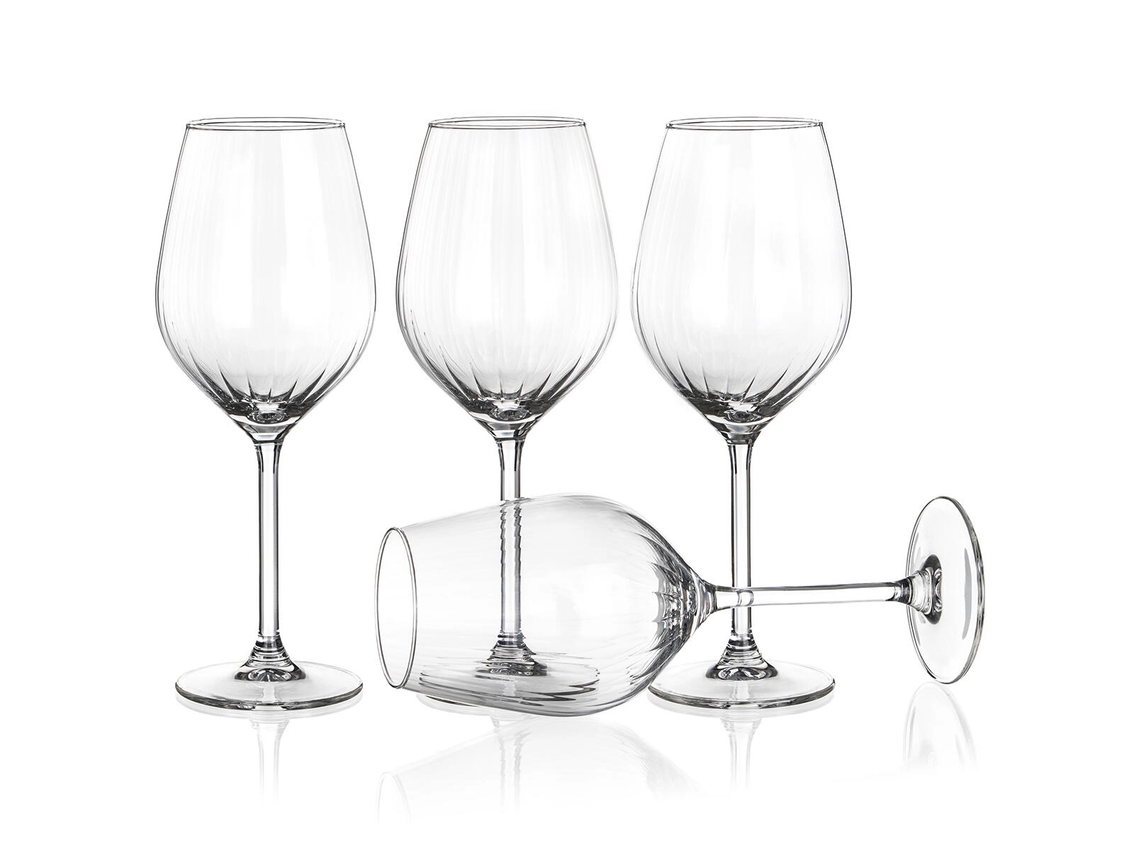 Elegantes Set aus vier Weingläsern aus der Kollektion Plissé von ROYAL LEERDAM mit idealem Volumen von 510 ml, dünner und robuster Ausführung mit gehärtetem Rand und perfekter Form für die Belüftung von Rotwein.