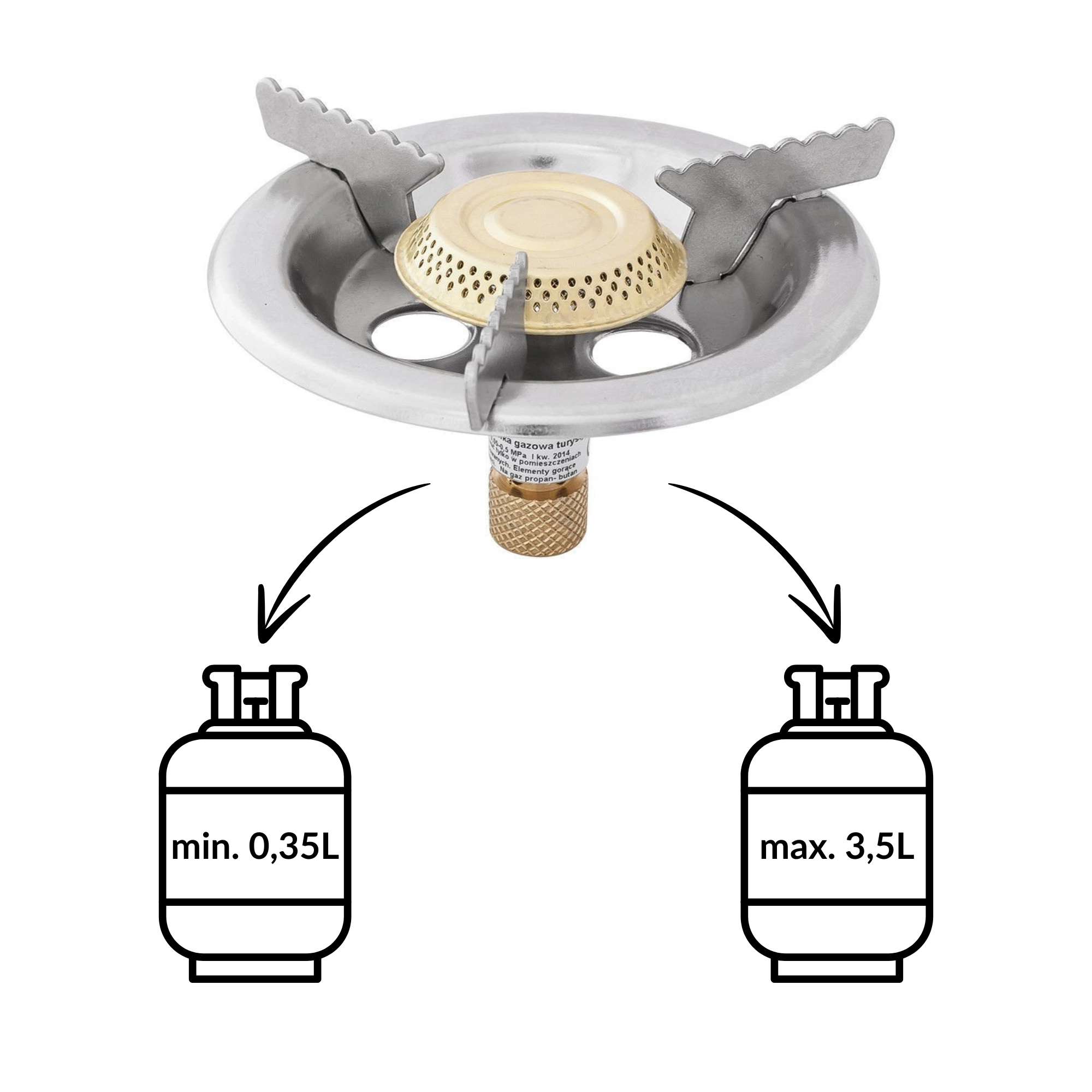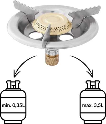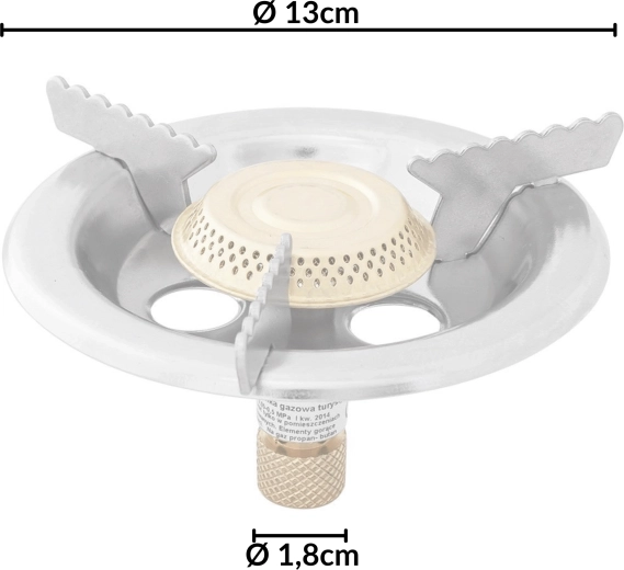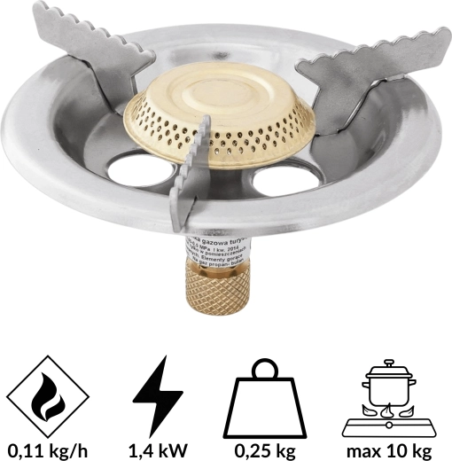 Die robuste Metallkonstruktion und drei gezahnte Auflagen gewährleisten hervorragende Stabilität des Kochgeschirrs, während Stahlabdeckungen des Brenners vor Wind schützen und die Verbrennungseffizienz erhöhen. Dank der kompakten Abmessungen und des geringen Gewichts von 0,25 kg lässt sich der Kocher leicht transportieren und beansprucht wenig Platz im Rucksack oder Auto.