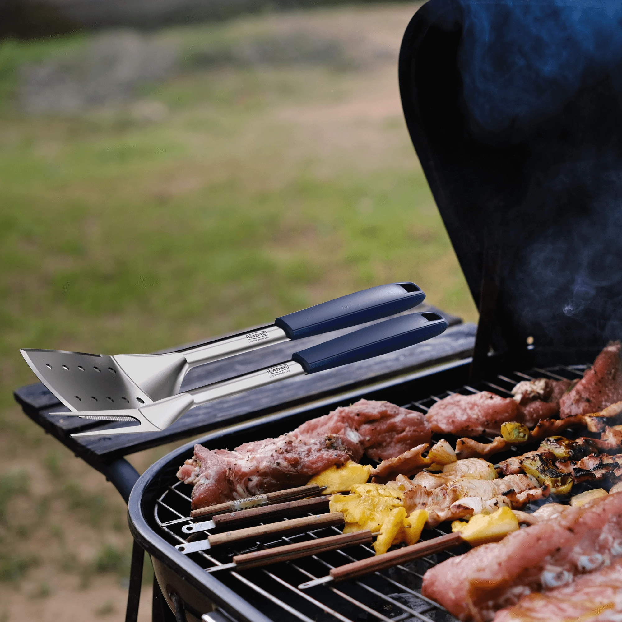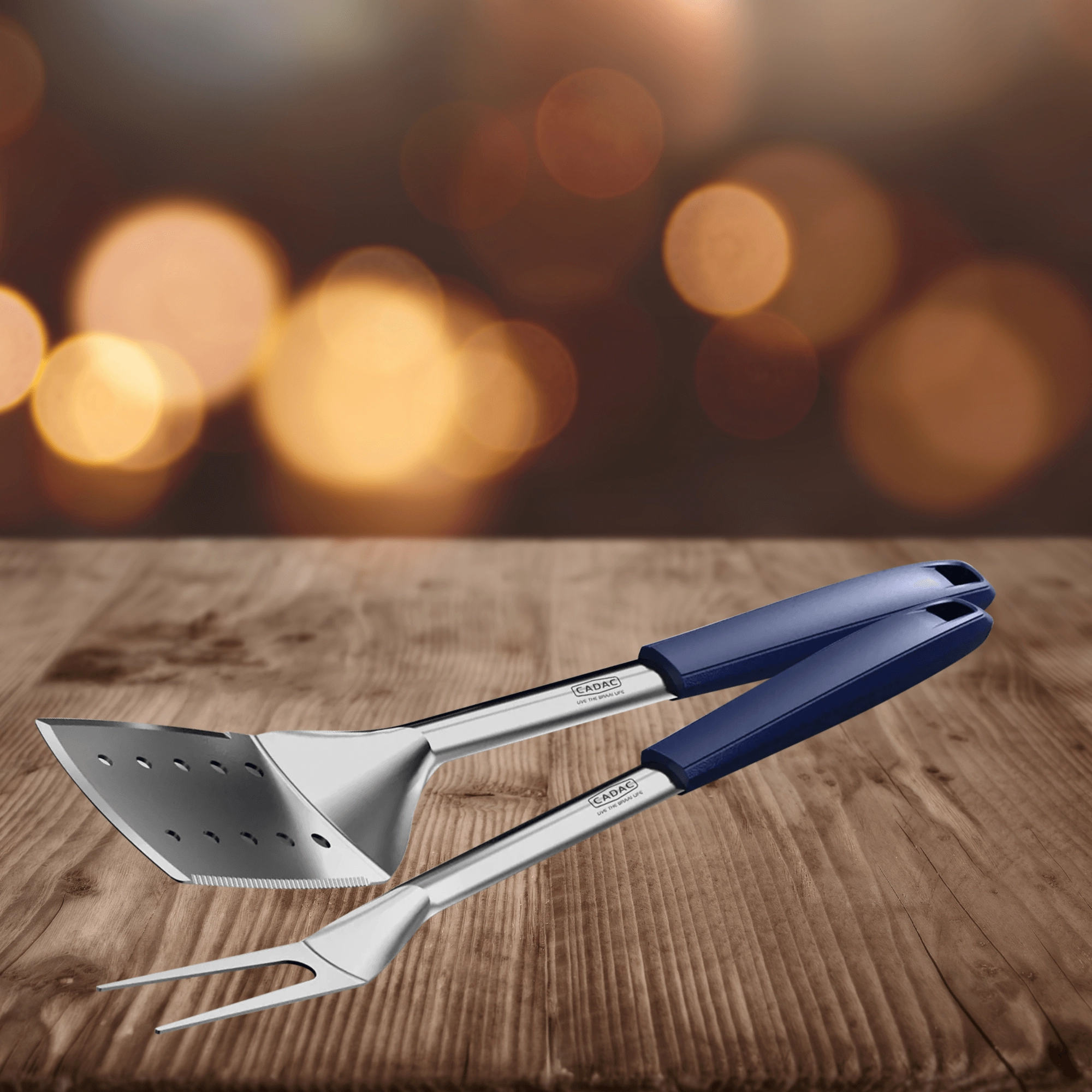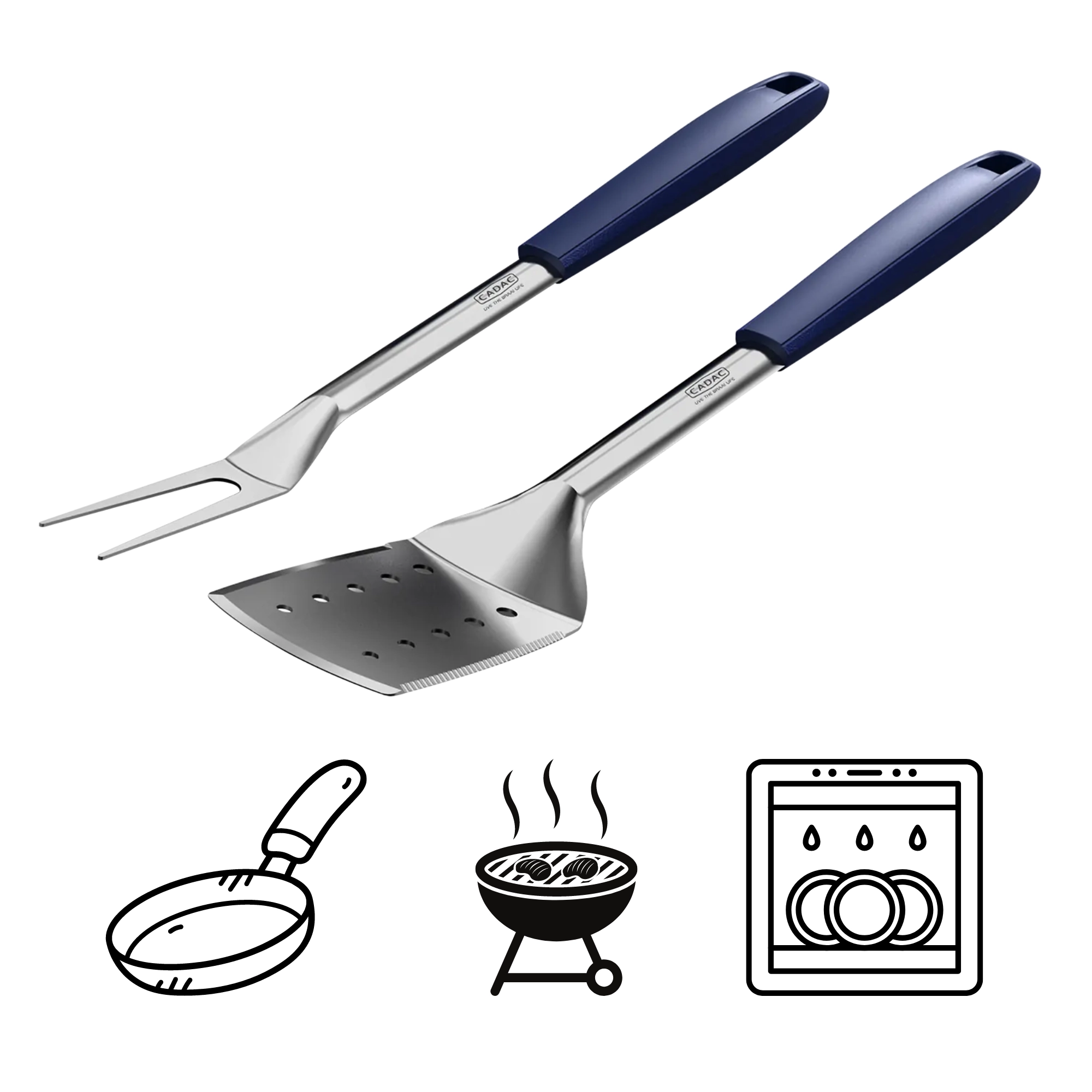 Das CADAC-Set kombiniert Edelstahl für die Arbeitsflächen mit hitzebeständigem Kunststoff an den Griffen. Das lange Werkzeug (45 cm) sorgt für Sicherheit und ausreichend Abstand zur Hitze, während magnetische Endkappen ein schnelles Ablegen auf Metalloberflächen ermöglichen (außer Edelstahl). Integrierte Ablagen halten die Spitzen über der Arbeitsplatte und verhindern Kontakt mit Verunreinigungen.