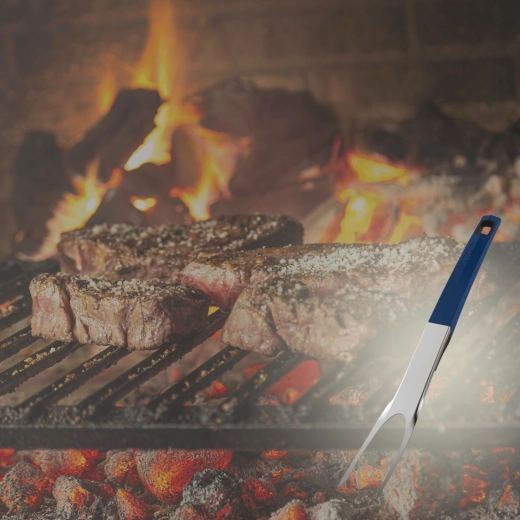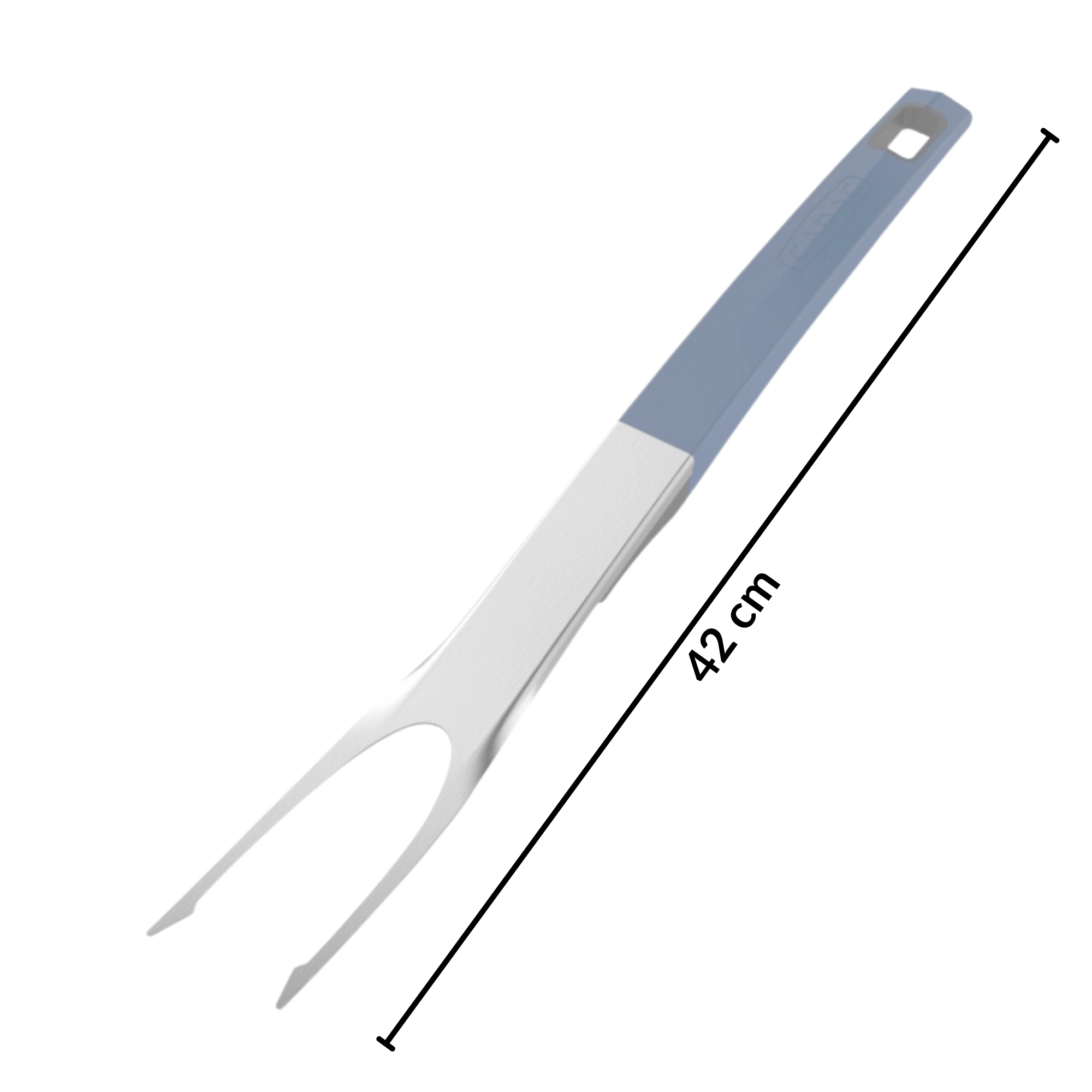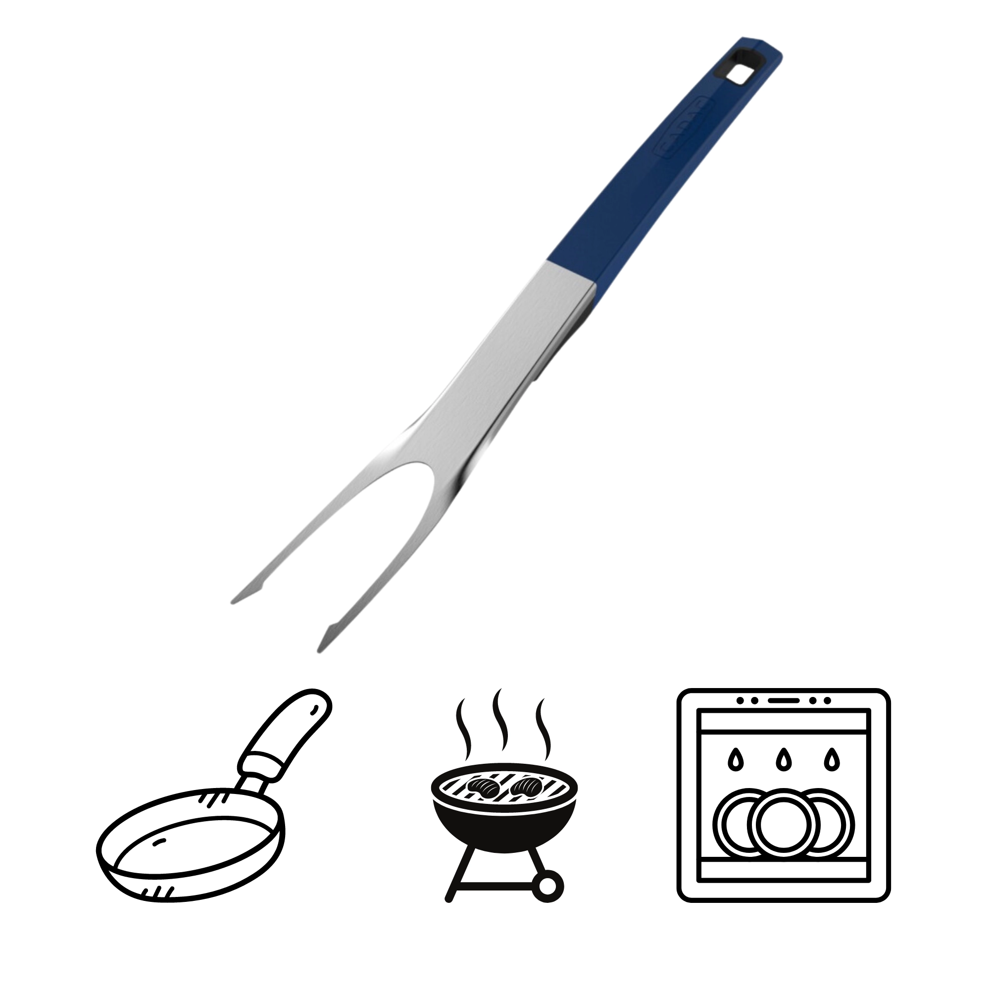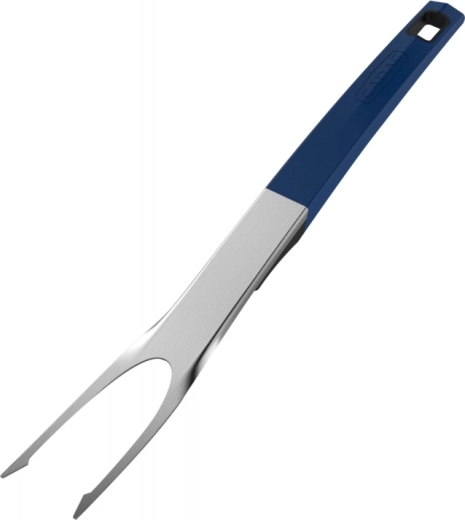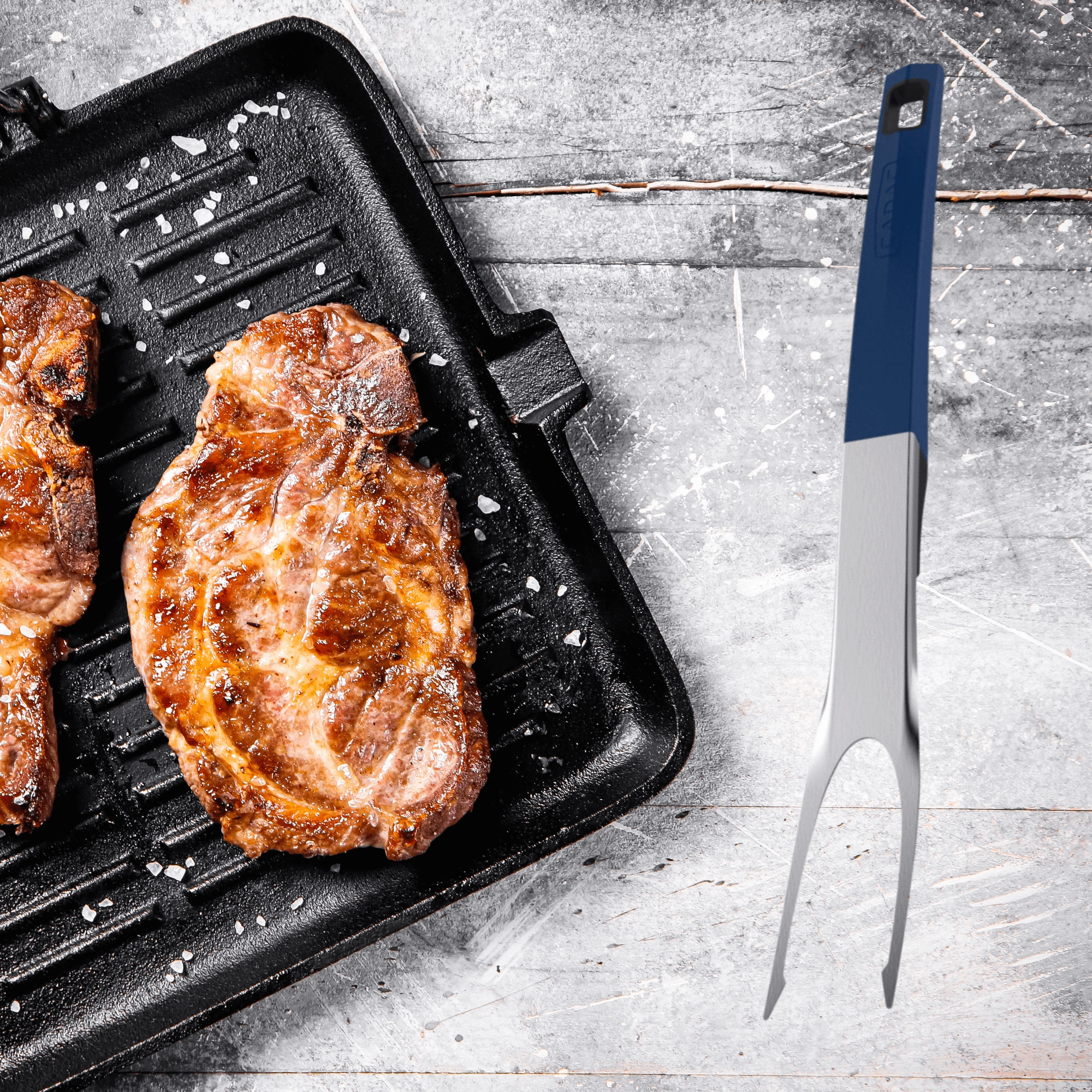 Praktische CADAC Grillgabel aus mattiertem Edelstahl mit ergonomischem Silikongriff in Blau für sicheren Halt und eine sichere Handhabung von Fleisch. Dank der 42 cm Länge bleiben die Hände vom heißen Bereich fern, die große Öse ermöglicht komfortables Aufhängen und das Material ist spülmaschinengeeignet.