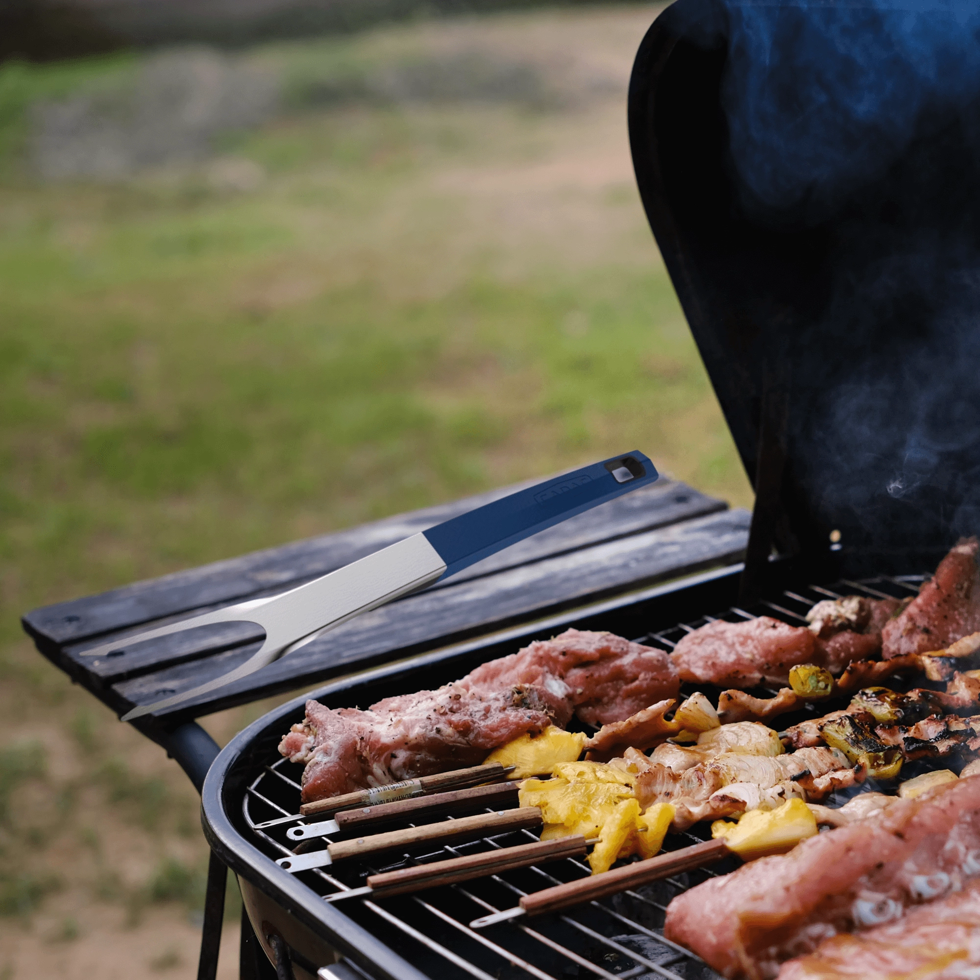 Matt gebürsteter Edelstahl sorgt für Widerstandsfähigkeit, präzises Aufspießen und eine lange Lebensdauer auch bei häufigem Grillen.