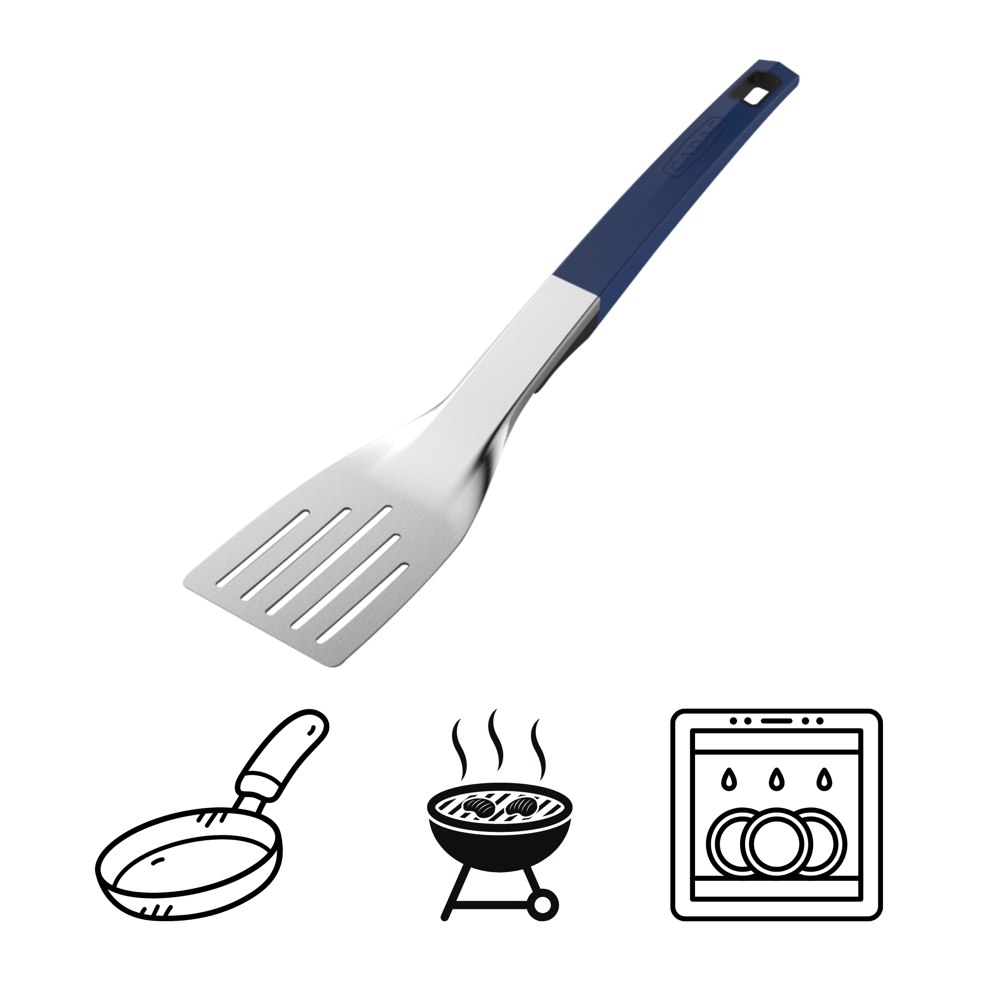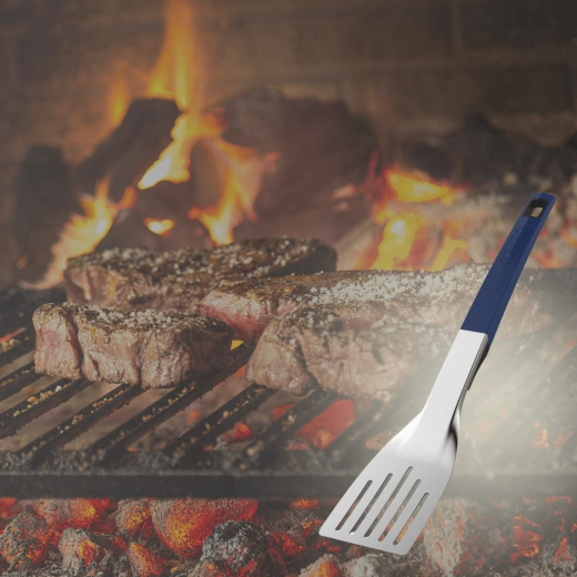 Praktischer Grillwender aus mattiertem Edelstahl mit blauem Silikongriff für einen sicheren und rutschfesten Halt. Dank der breiten perforierten Klinge wenden Sie Speisen mühelos und lassen gleichzeitig Fett abtropfen, die große Aufhängeöffnung spart Platz und das Werkzeug ist spülmaschinengeeignet.
