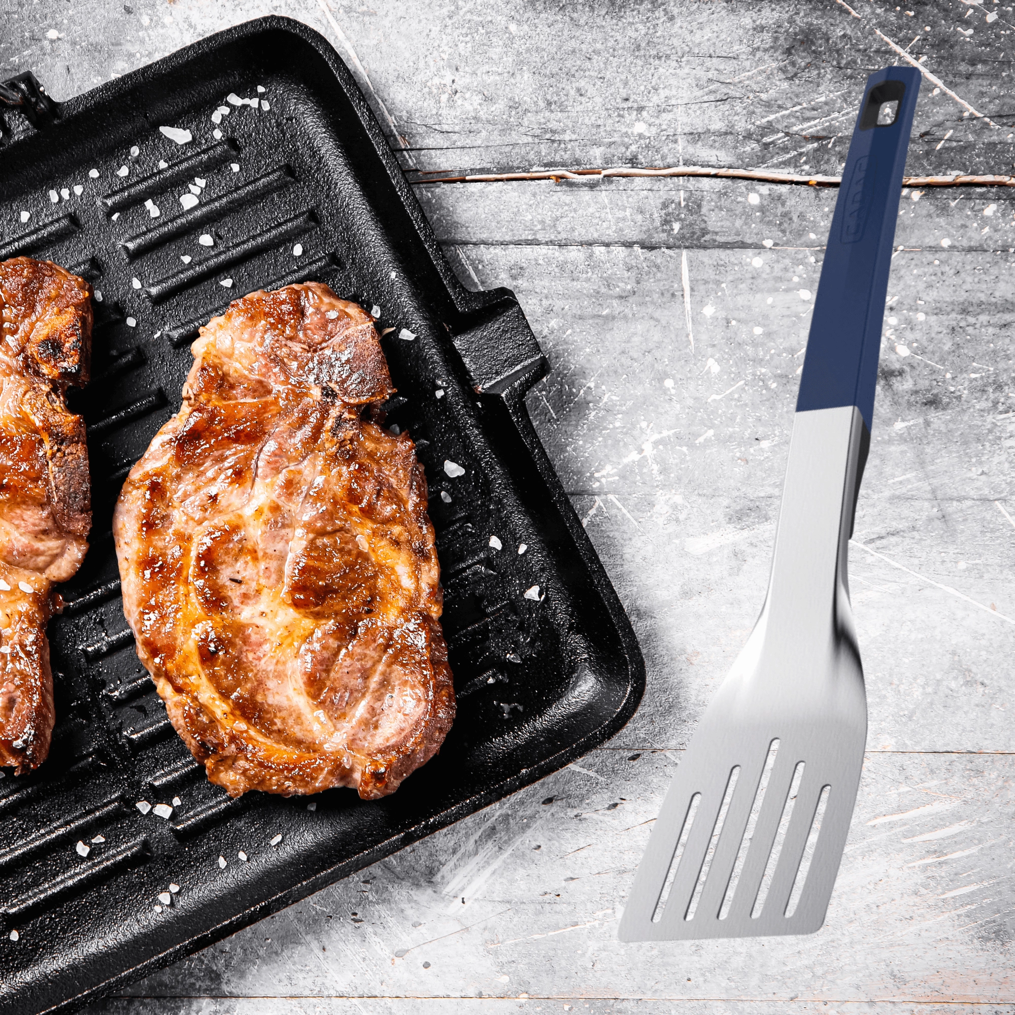 Die breite, perforierte Klinge ermöglicht effizientes Aufnehmen und Wenden von Fleisch, Gemüse oder Fisch; die Öffnungen helfen, überschüssiges Öl und Säfte abzuführen. Nach dem Einsatz einfach in der Spülmaschine reinigen und an der praktischen Öffnung aufhängen.