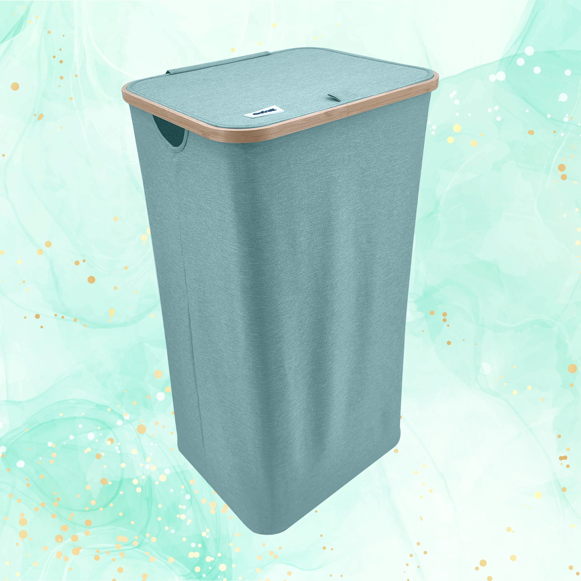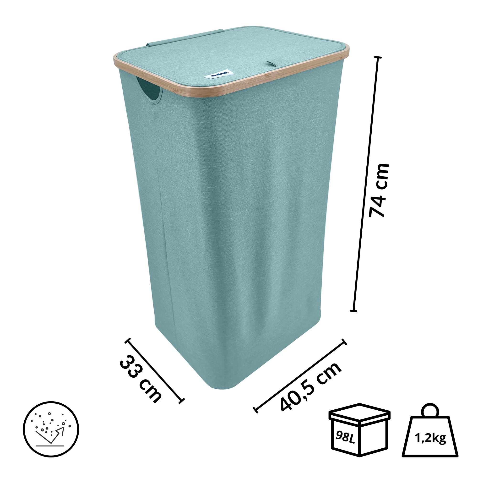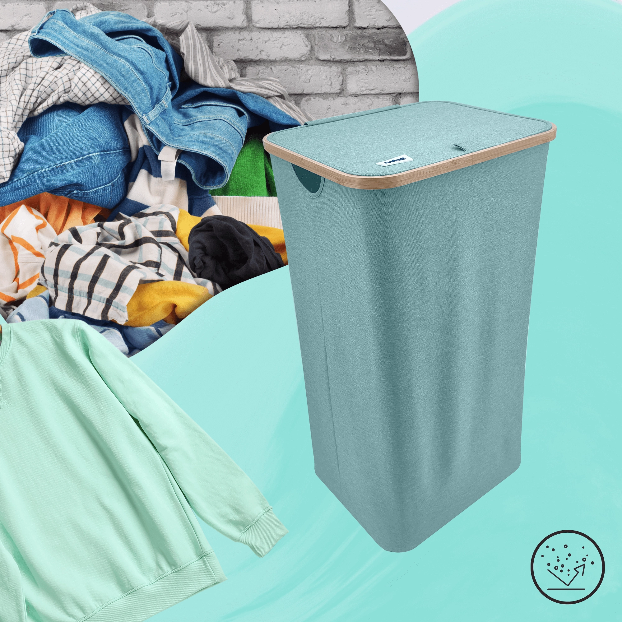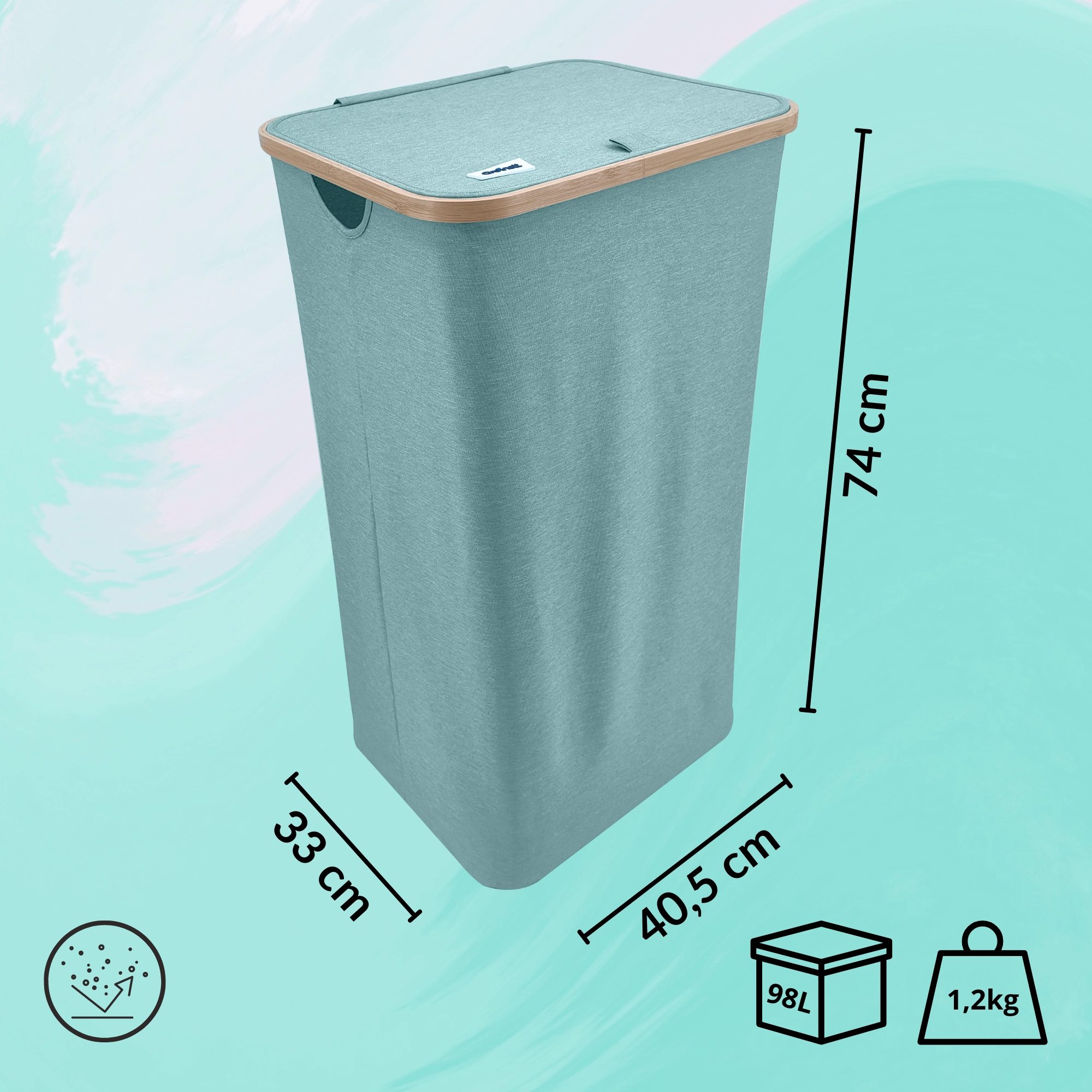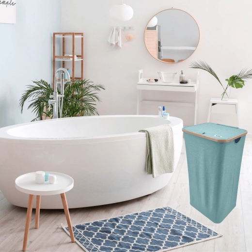 Stilvoller und geräumiger Wäschekorb in Mintgrün mit elegantem Bambusrahmen bringt natürliche Akzente und Ordnung in Ihr Bad oder Schlafzimmer. Dank eines Volumens von 98 Litern, robustem und atmungsaktivem Polyester, einem Deckel gegen Gerüche und Seitengriffen meistert er mühelos den Alltag. Die faltbare Konstruktion spart Platz, wenn sie gerade nicht benötigt wird.