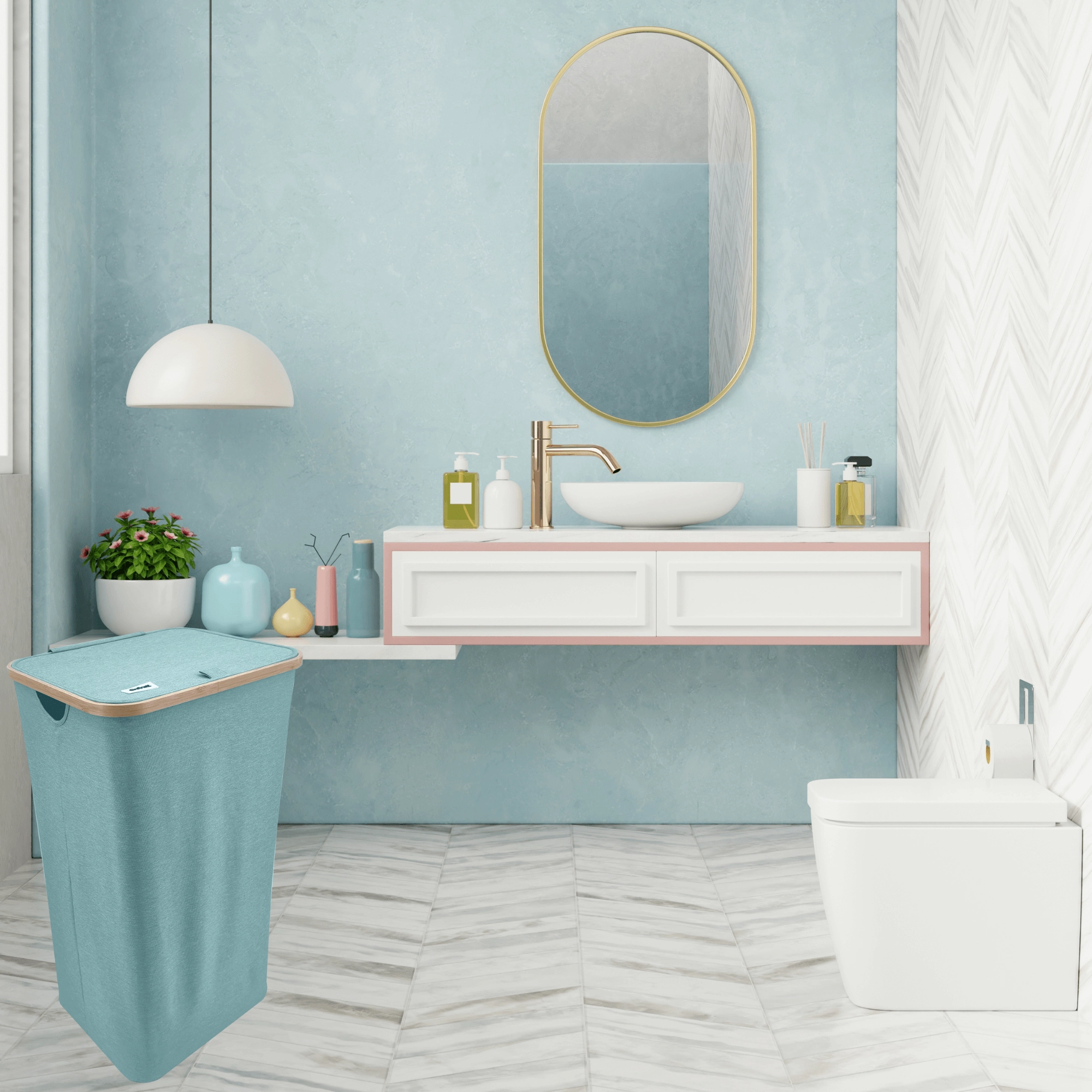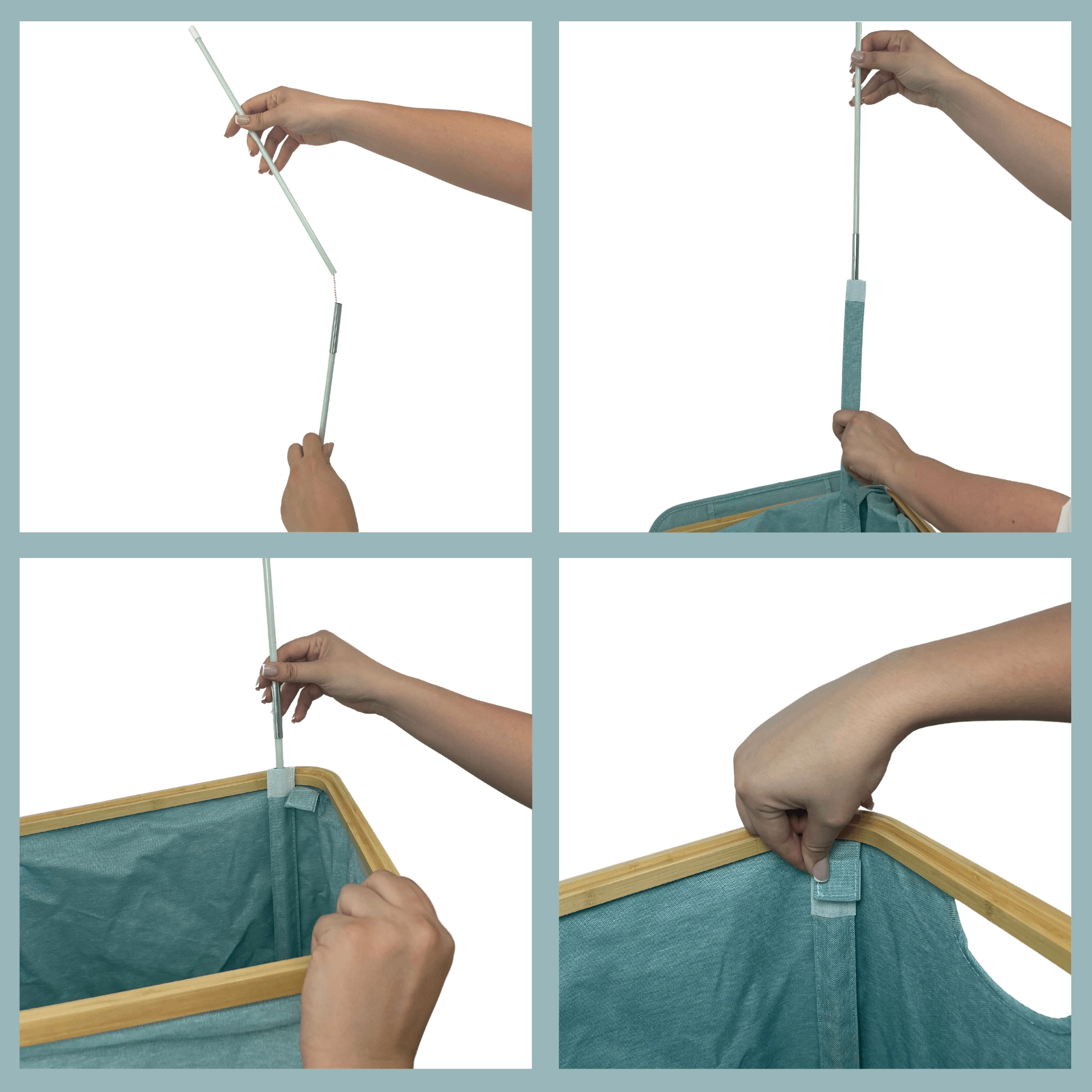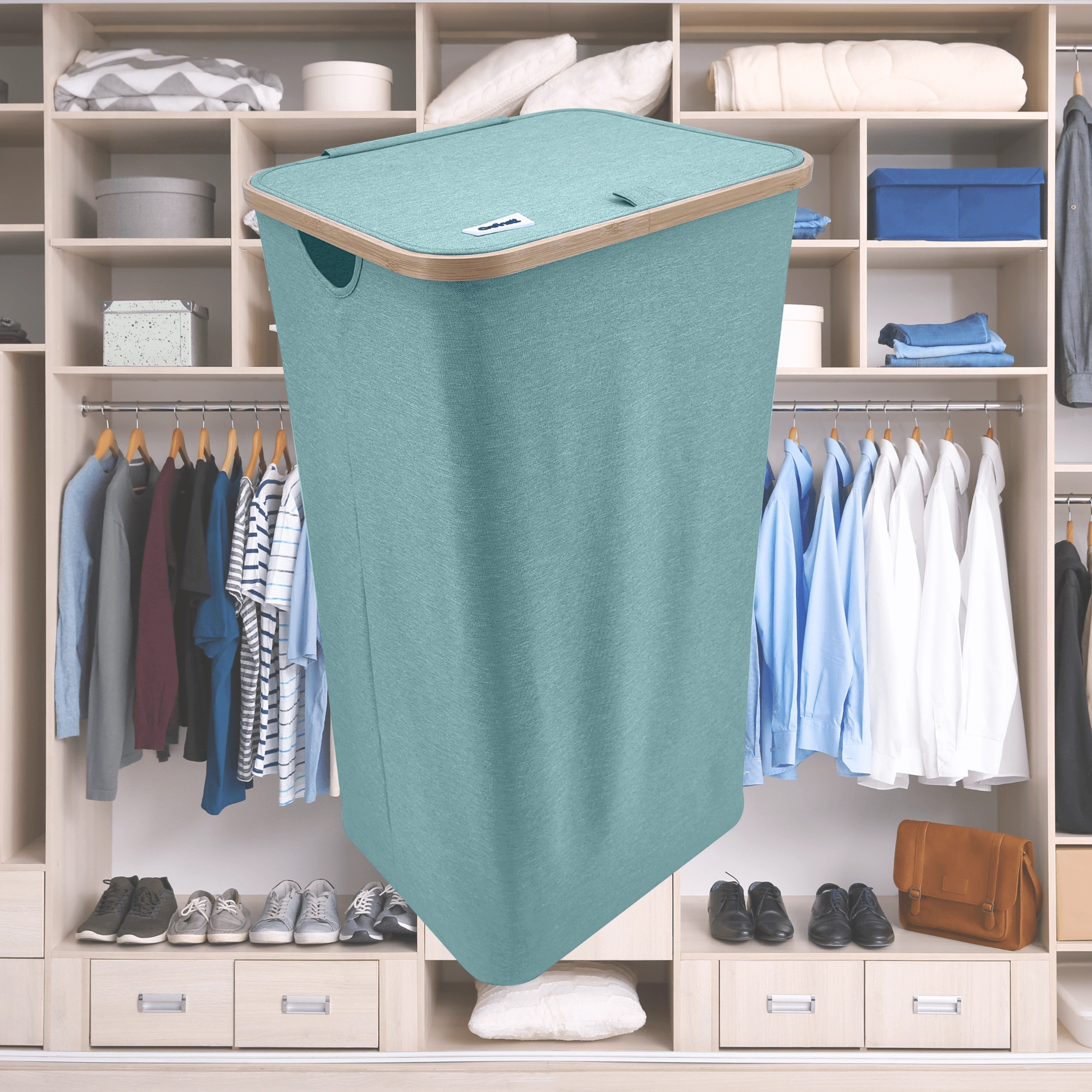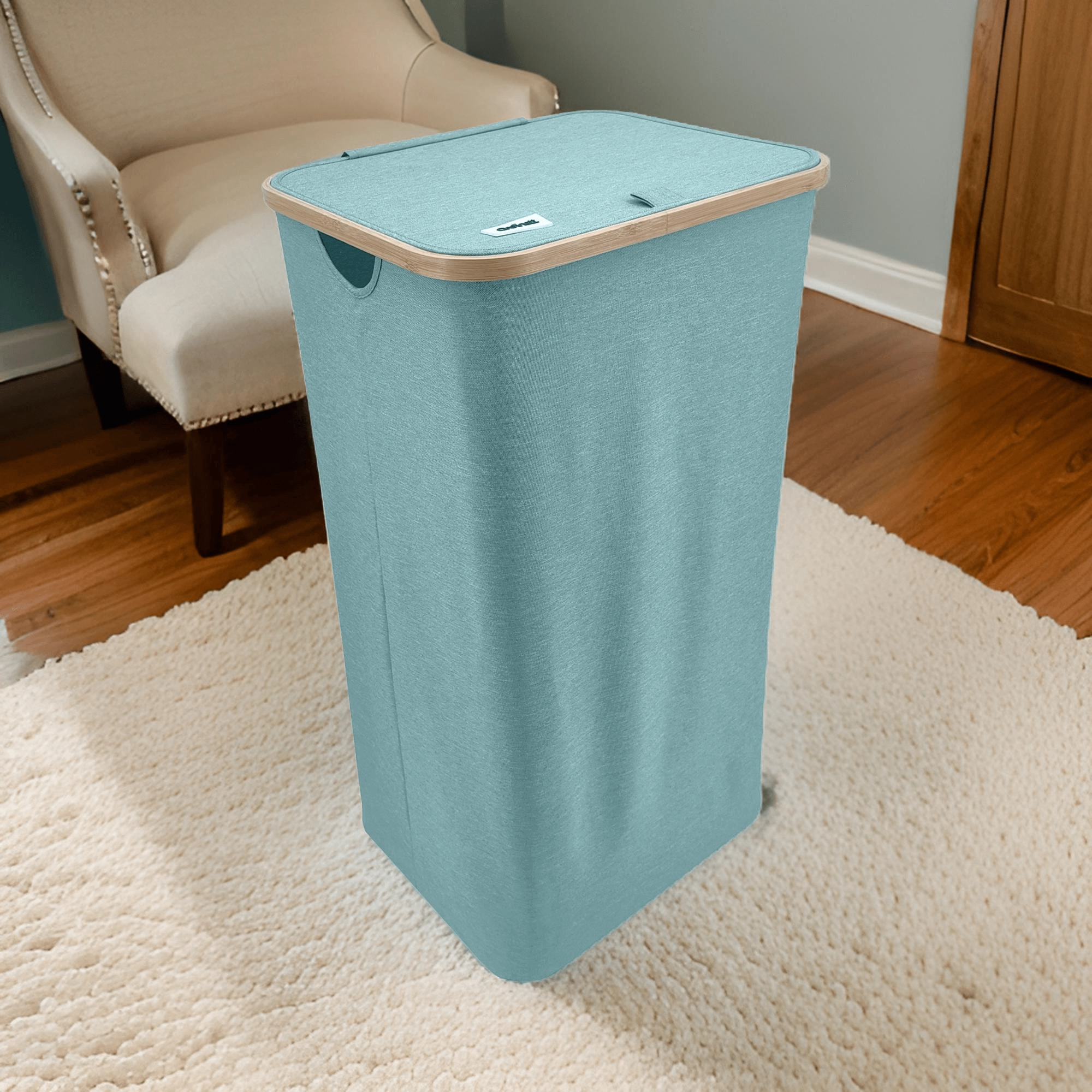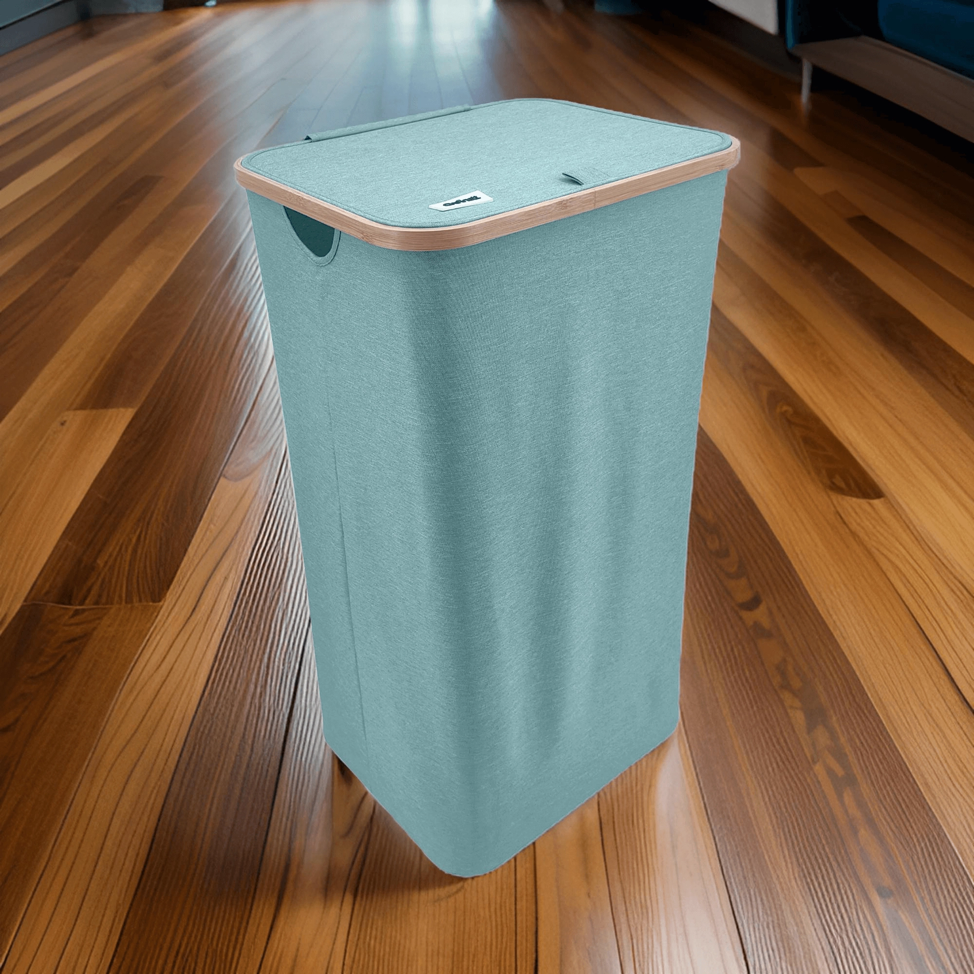 Stilvoller und geräumiger Wäschekorb in Mintgrün mit elegantem Bambusrahmen bringt natürliche Akzente und Ordnung in Ihr Bad oder Schlafzimmer. Dank eines Volumens von 98 Litern, robustem und atmungsaktivem Polyester, einem Deckel gegen Gerüche und Seitengriffen meistert er mühelos den Alltag. Die faltbare Konstruktion spart Platz, wenn sie gerade nicht benötigt wird.