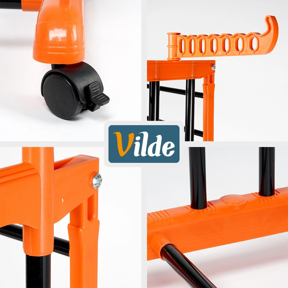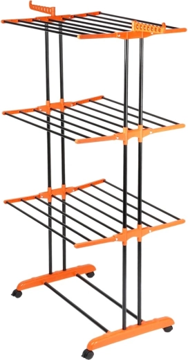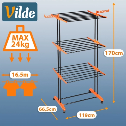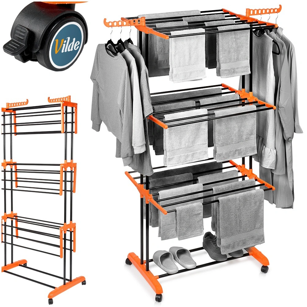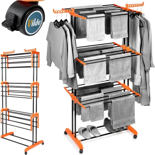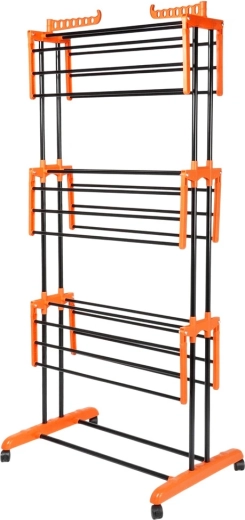 Der vertikale Wäscheständer Vilde mit drei Ebenen spart effizient Platz und ermöglicht das Trocknen großer Wäschemengen auf minimaler Fläche. Die schwarz pulverbeschichteten Metallstangen sind feuchtigkeitsbeständig, orangefarbene Kunststoffverbinder sorgen für Stabilität und Langlebigkeit. Ein Abstand von 50 cm zwischen den Ebenen verbessert die Luftzirkulation und beschleunigt das Trocknen.