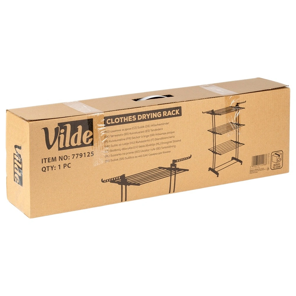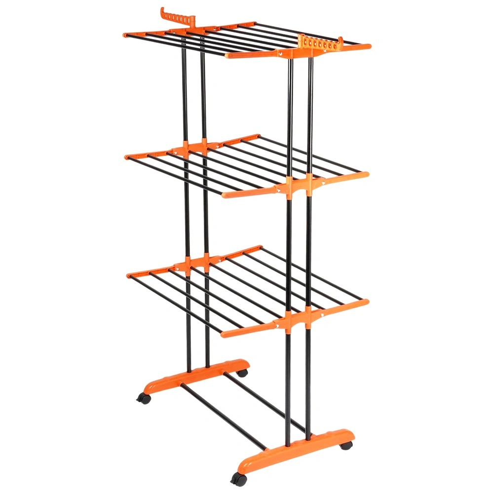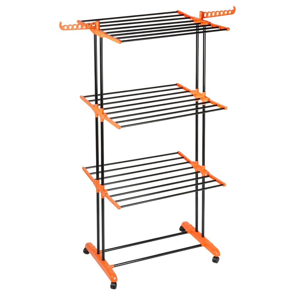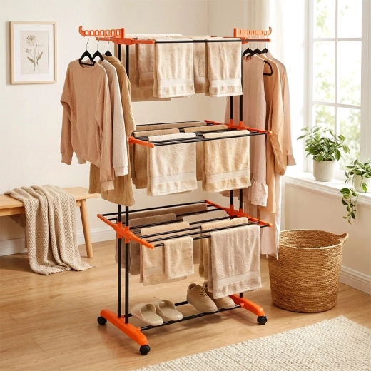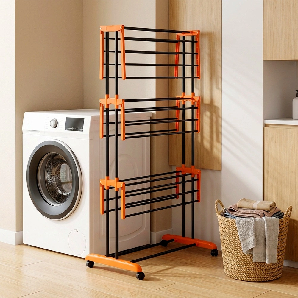 Praktischer dreistufiger Wäscheständer mit robuster Metallkonstruktion und Rollen für einfaches Verschieben. Bietet bis zu 16,5 m Trockenfläche, 24 stabile Stangen, klappbare Flügel und seitliche Arme für Kleiderbügel zur maximalen Platzausnutzung. Dank stabilem Rahmen und zwei feststellbaren Rollen ideal für Wohnung, Balkon oder Terrasse.