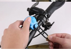 Die Montage gelingt in wenigen Augenblicken ganz ohne Werkzeug. Die universelle Halterung passt auf die meisten Lenker mit 23,8–31,8 mm Durchmesser. Es stehen 5 Klangmodi zur Verfügung; die Auswahl ändern Sie durch 5-sekündiges Gedrückthalten der Taste. Die Stromversorgung übernehmen 2× CR2032, die im Lieferumfang enthalten sind.