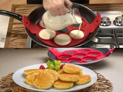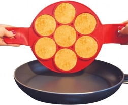 Diese multifunktionale Form aus lebensmittelechtem Silikon erleichtert die Zubereitung von Frühstück und schnellen Abendessen. Legen Sie sie einfach in die Pfanne, füllen Sie die Öffnungen mit Teig und drehen Sie sie nach dem Anbacken mithilfe der seitlichen Griffe um – so erhalten Sie gleichmäßig gebackene und perfekte Formen ohne Auslaufen des Teigs.