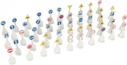 Eine große Auswahl der meistverwendeten Zeichen in verschiedenen Formen und Farben ermöglicht Kindern, reale Verkehrssituationen nachzustellen und spielerisch sicher zu lernen.