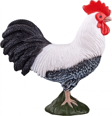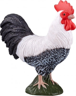 Detailgetreu geformtes Gefieder, kontrastreiche Schwarz-Weiß-Färbung und roter Kamm für ein authentisches Erscheinungsbild des Hahns.