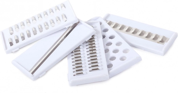 Die Sicherheit bei der Arbeit gewährleistet ein Lebensmittelhalter und Schutzabdeckungen für die Klingen für eine sichere Aufbewahrung. Alle Teile sind spülmaschinengeeignet bis 60 °C, was Zeit und Mühe spart. Das Set enthält 7 austauschbare Einsätze für maximale Vielseitigkeit sowie einen Korb–Abtropfeinsatz für schnelles Abspülen.