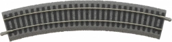 Gebogenes Gleis von PIKO mit detailgetreuer Nachbildung von Holzschwellen auf Schotterbett. Ideal für Modellbauer, die eine originalgetreue Verarbeitung und hohe Qualität suchen.