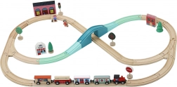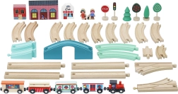 • 40 Teile: Lokomotive, 4 Waggons, 24 Schienenteile, Bahnhof, Häuser, Bäume, Verkehrsschilder