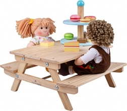 Setzen Sie Ihre Puppen und Kuscheltiere zum Tee oder Mittagessen mit dieser stabilen Holz-Picknickbank. Ideal für kreative Kinderspiele mit hochwertigen Materialien.