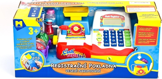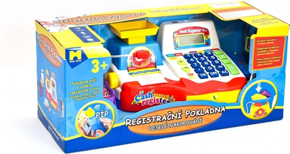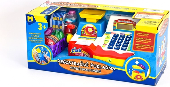 Beliebte Spielkasse mit ausziehbarer Geldschublade, funktionierenden Tasten, Mikrofon, Waage, Körbchen und einer Reihe von Lebensmittelattrappen für kleine Kaufleute. Batteriebetrieben. Geeignet für Kinder ab 3 Jahren.