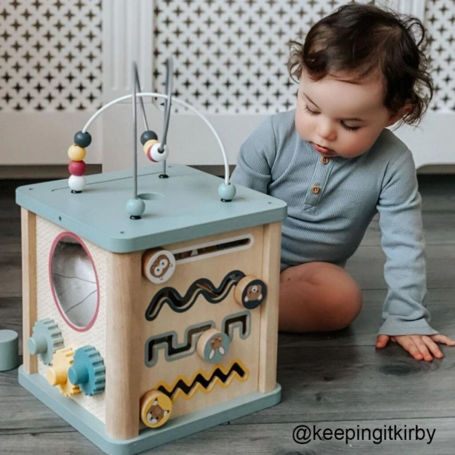 Entdecken Sie den vielseitigen motorischen Würfel aus hochwertigem 100% FSC-Holz, der Kinder stundenlang beschäftigt. Auf jeder Seite wartet eine andere Aktivität – Formensteckspiel, Kugelbahn, Zahnräder und mehr. Die Kombination aus naturbelassenem Holz und zarten Pastellfarben ist ideal für Mädchen und Jungen. Das Spielzeug fördert Motorik, Kommunikation und das Erkennen von Zahlen und ist dank FSC-zertifizierter, schonender Materialien sicher für Kinder.