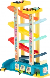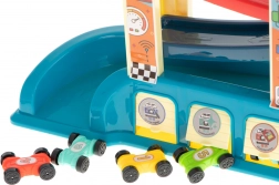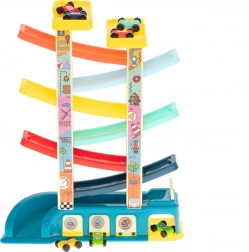 Auf die Plätze, fertig, los! Welches der farbenfrohen Autos erreicht als erstes das Ziel? Die mehrstöckige Rennbahn garantiert actionreiche Abfahrten mit spektakulären Sprüngen zwischen den Etagen und eine flüssige Fahrt bis nach unten. Der Start kann auf zwei Ebenen erfolgen – aus der obersten oder der zweiten Etage – und sorgt so jedes Mal für ein anderes Rennerlebnis.