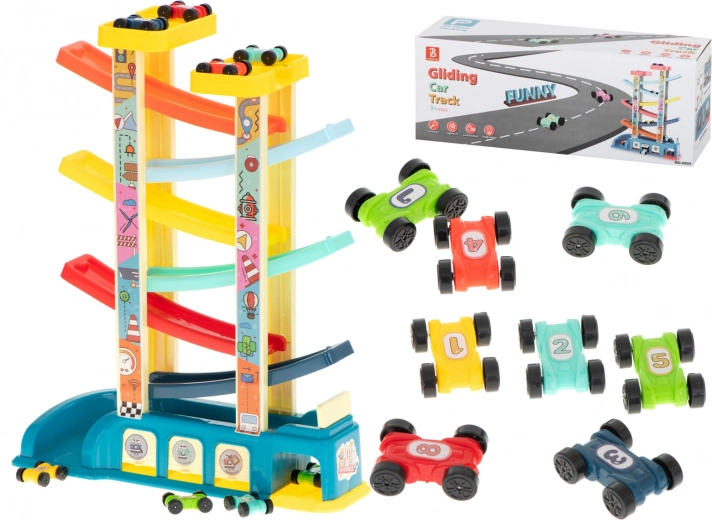 Bunte Autorennbahn mit Rutsche und Garage – 8 Autos