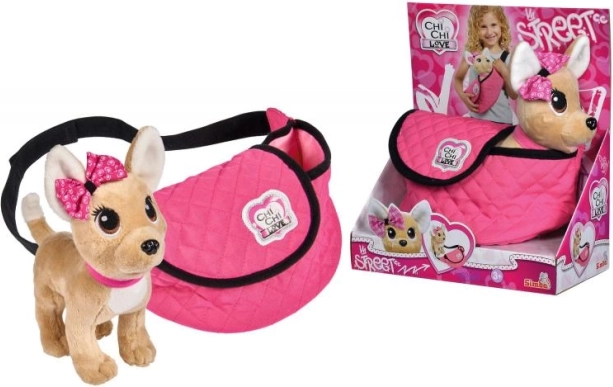 Gehe auf Abenteuer mit dem Plüschhund Chi Chi Love, dem perfekten Modeaccessoire für alle kleinen Hundefans. Sein elegantes rosa Halsband passt perfekt zur modernen rosa Handtasche mit schwarzer Paspel, ideal für stylisches Tragen.