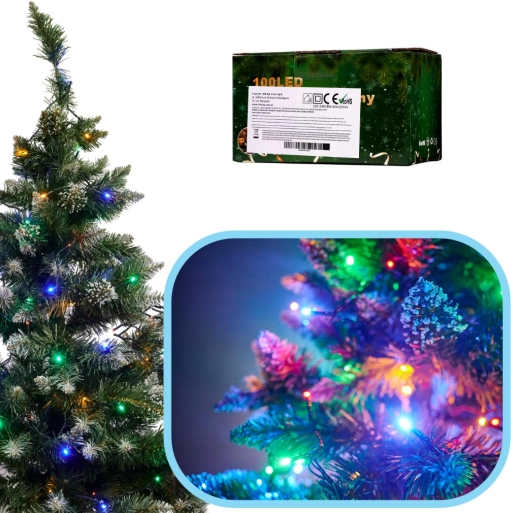 Tauchen Sie Ihr Zuhause in festliche Stimmung mit einer 10 m langen LED-Lichterkette mit 100 bunten Dioden. Sie bietet 8 Lichtmodi, Netzbetrieb ohne Batterien und energieeffiziente LED-Technologie. Das grüne Kabel verschwindet unauffällig zwischen den Zweigen des Baums und die praktische Verbindung für eine zweite Kette ermöglicht es, die Dekoration nach Bedarf zu erweitern.