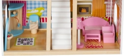 Das Puppenhaus aus Holz ist ein großartiges Spielzeug, das die Kreativität und soziale Fähigkeiten der Kinder fördert. Es hat drei Ebenen, die durch schöne weiße Treppen verbunden sind, und enthält insgesamt fünf Räume, einen Balkon und einen Garten mit Pool. Es ist mit verschiedenen farbenfrohen und angenehmen Elementen ausgestattet, die für langen Spielspaß sorgen.