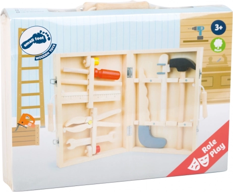 Schenken Sie Kindern ein authentisches Erlebnis beim Arbeiten mit Werkzeug mit dem Small Foot Koffer Maik. Alles ist übersichtlich in einem robusten Holzkoffer mit Seilgriffen verstaut. Hammer, Säge und Rohrzange sind gegen Verrutschen gesichert, die übrigen Teile werden in ausklappbare Halterungen eingesetzt, die sich dank großer Holzschrauben leicht entnehmen lassen.