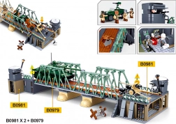 Bauset mit Brücke, Bunker, Fahrzeug, Minifiguren und Zubehör; Bauanleitung