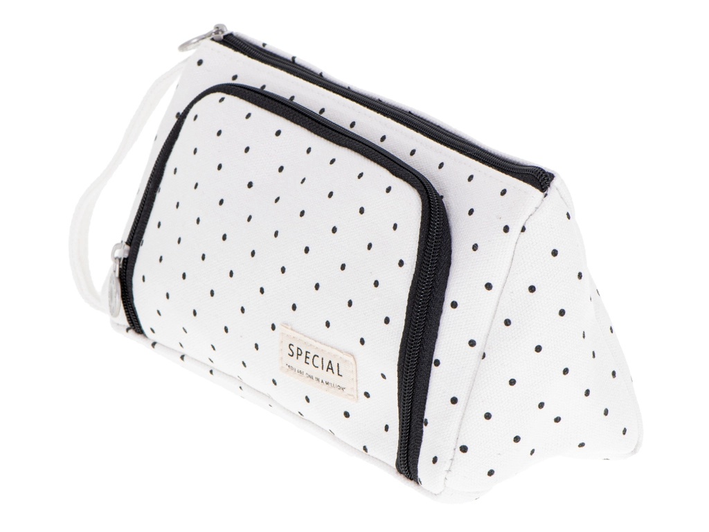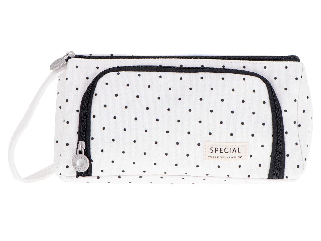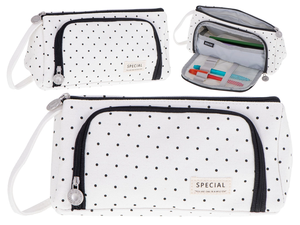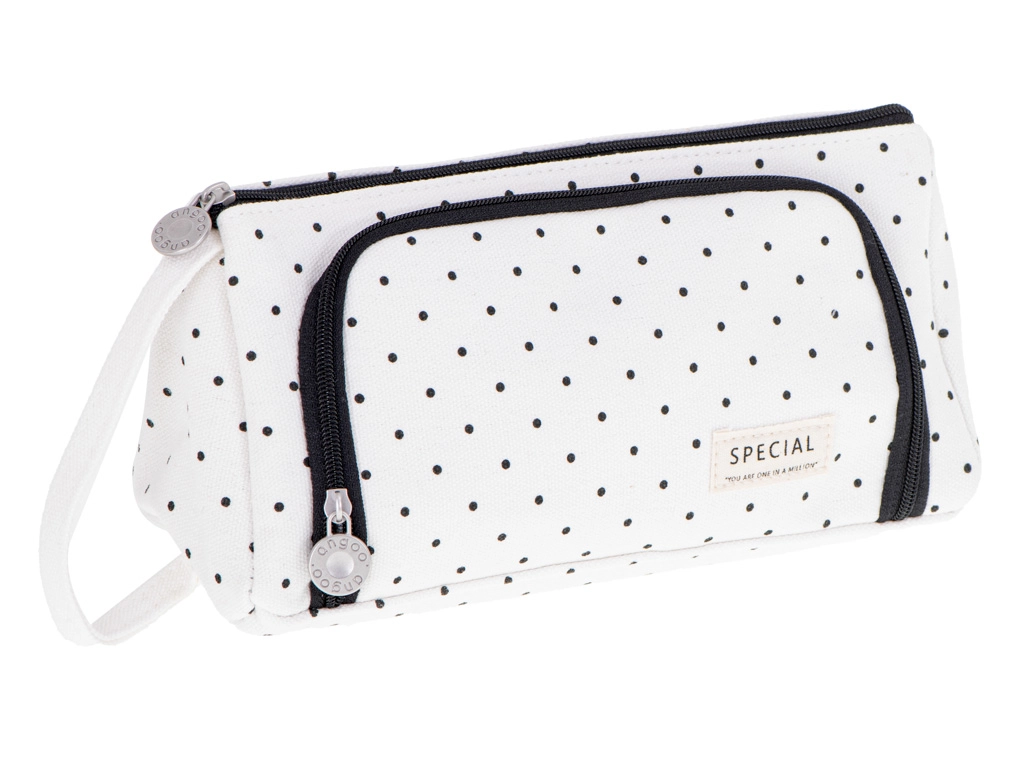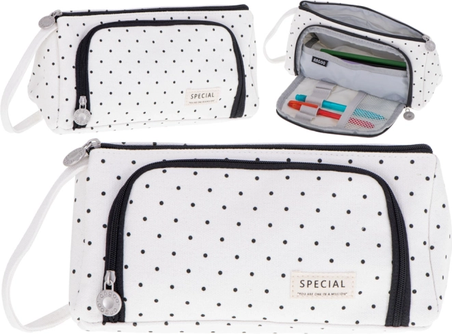 Praktisches und stylisches 3‑in‑1-Etui in Weiß mit schwarzen Punkten bietet zwei geräumige Fächer, viele Innenfächer und elastische Halterungen für eine übersichtliche Aufbewahrung von Schreibwaren. Dank Handgelenkschlaufe und robustem Material ist es ideal für Schule, Büro und Reisen – eignet sich auch hervorragend als Kosmetiktasche oder Reise-Organizer.