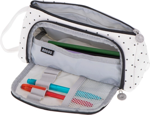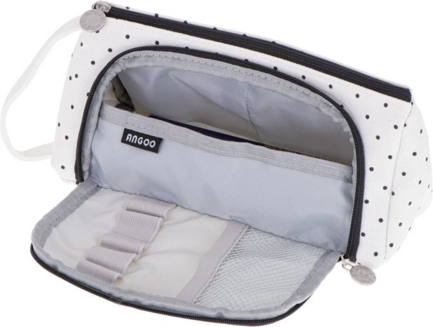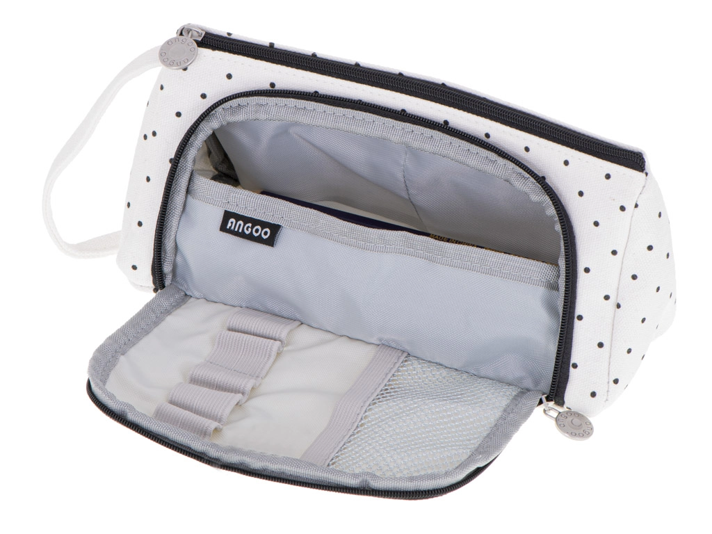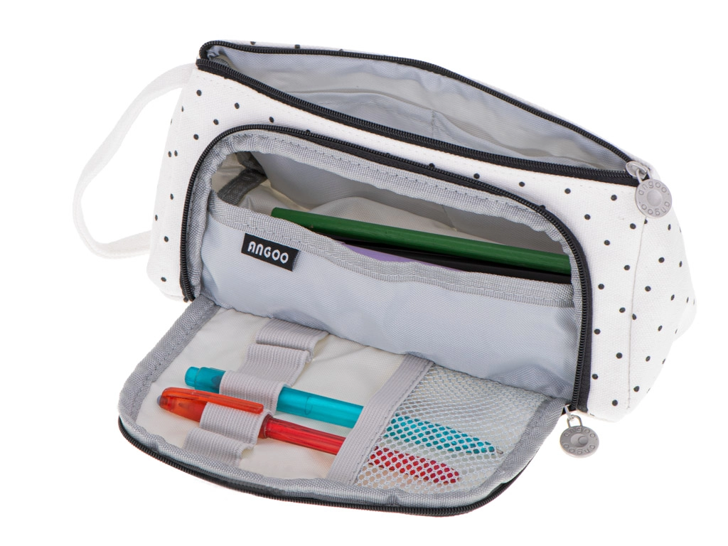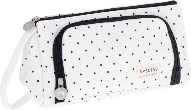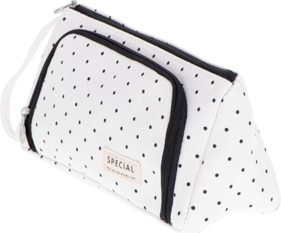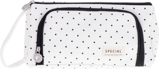 Praktisches und stylisches 3‑in‑1-Etui in Weiß mit schwarzen Punkten bietet zwei geräumige Fächer, viele Innenfächer und elastische Halterungen für eine übersichtliche Aufbewahrung von Schreibwaren. Dank Handgelenkschlaufe und robustem Material ist es ideal für Schule, Büro und Reisen – eignet sich auch hervorragend als Kosmetiktasche oder Reise-Organizer.