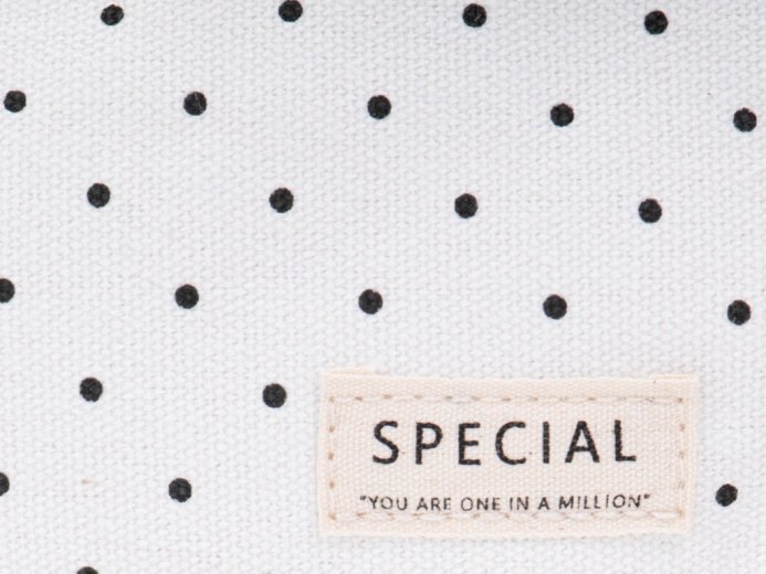 Weißer Hintergrund mit schwarzen Punkten und ein dezentes SPECIAL-Label verleihen der Tasche einen modernen, universellen Look.