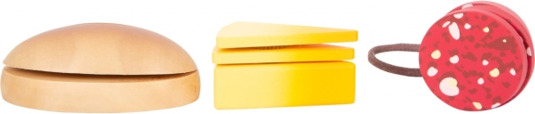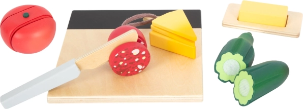 Buntes Obst, Gemüse, Käse, Salami und Gebäck lassen sich dank Klettverschluss hervorragend schneiden und wieder zusammensetzen – ideal zum Üben der richtigen Schneidetechnik.