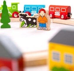 • 19-teiliges Set: 8 Schienen, 1 Lokomotive, 2 Waggons, 8 Zubehörteile (Häuser, Bäume, Figuren)