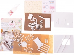 Im Lieferumfang ist alles enthalten: Bauteile des Zimmers, Ausstattungselemente und Dekorationen, Kleber sowie eine ausführliche Anleitung mit Bildern. Die Beleuchtung wird mit 2× AAA 1,5 V und 3× LR54 1,5 V betrieben (Batterien sind nicht im Lieferumfang). Empfohlen ab 8 Jahren. Das fertige Modell misst 17,1 × 13 × 11,6 cm; die Verpackung 25 × 18 × 6 cm.