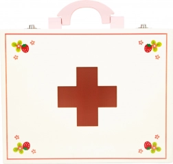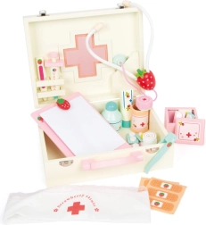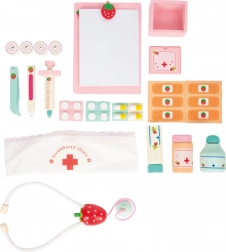 Dieser hochwertige hölzerne Arztkoffer Small Foot Isabel ist ideal für kindliche Rollenspiele. Das Set umfasst 24 Zubehörteile, darunter ein textiles Stirnband mit rotem Kreuz und bunte Arztinstrumente mit Erdbeer-Motiv, die jedes Kind erfreuen.