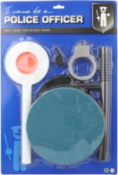 Dieses Polizeiset erfreut alle kleinen Gesetzeshüter. Es enthält eine Stoffmütze (ca. 20 × 20 cm, Schirmlänge 23 cm) und Kunststoff-Zubehör für Rollenspiele: Polizeikelle (ca. 33 cm), Pfeife, Handschellen und Schlagstock (ca. 29,5 cm). Geeignet ab 3 Jahren.