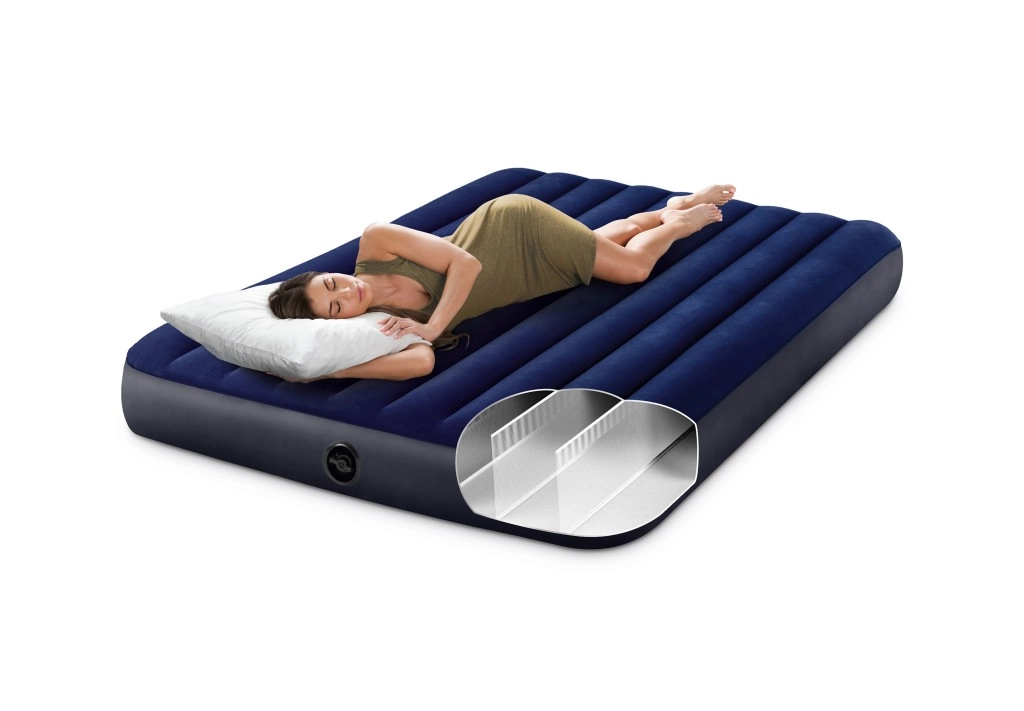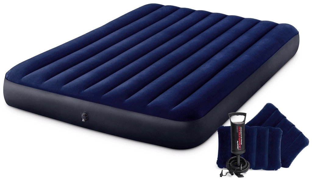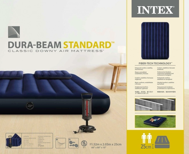 Praktische aufblasbare INTEX-Matratze für zwei Personen mit den Maßen 203 × 152 × 25 cm, weicher Velours-Oberfläche und stabiler Konstruktion für erholsamen Schlaf zu Hause und unterwegs. Im Lieferumfang enthalten sind eine Handkolbenpumpe, 2 aufblasbare Kissen und ein Reparaturflicken. Dank des Boston-Ventils ist das Auf- und Ablassen der Luft schnell und einfach.