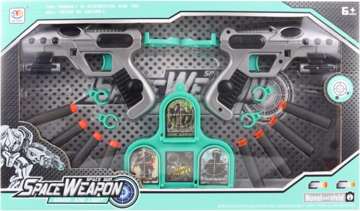 Erleben Sie actionreichen Spaß mit einem Duo aus Weltraum-Pistolen, die sichere Schaumstoff-Darts verschießen. Im Set enthalten sind zwei Pistolen, 10 Schaumstoff-Darts (5 mit Saugnapf und 5 ohne) sowie eine einfache Bedienung für Kinder ab 6 Jahren. Ideal für Schießwettbewerbe, Zieltraining und fantasievolle Spiele mit Weltraumthema.