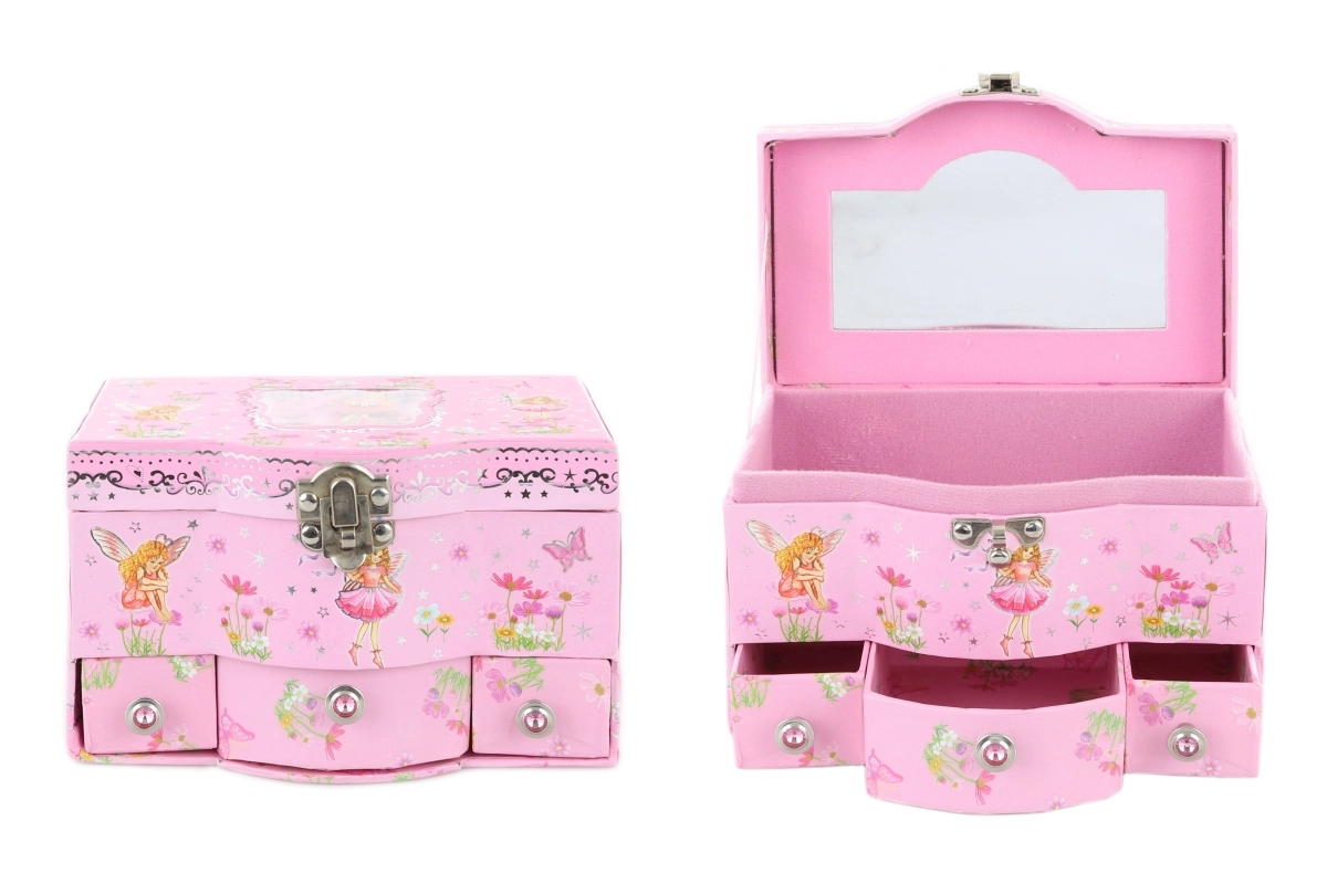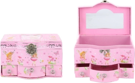 Schmuckkästchen mit Schubladen. Im Deckel des Schmuckkästchens befindet sich ein Spiegel, und im unteren Teil des Schmuckkästchens sind 3 praktische Schublädchen. Maße des Schmuckkästchens ca. 17 x 11,5 x 10 cm. Verpackt im Beutel. Alter 3+
