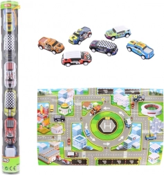 Set aus Metall-Spielzeugautos mit Spielteppich
