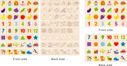 Die Kinder legen die Holzstücke entsprechend der Bilder auf der Platte in die richtigen Öffnungen. Sie trainieren Logik, Aufmerksamkeit und Feinmotorik bei jedem Spiel.