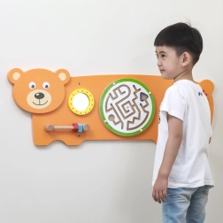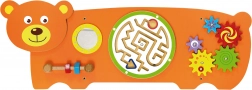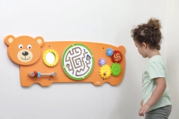 Die Sinnestafel Bär ist nach Montessori-Prinzipien gestaltet, um Kinder auf natürliche Weise zum Entdecken und Üben von Fähigkeiten zu motivieren. Sie bietet mehrere Aktivitäten: Drehen der Zahnräder, Führen der Kugel im Labyrinth, Beobachten im sicheren Spiegelchen und Training des Griffs mit Schrauben auf Gewinde. Dank der robusten Holzkonstruktion und der Möglichkeit zur Wandmontage eignet sie sich ideal für Kinderzimmer, Spielräume und Kindergärten.