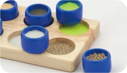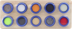 Die Platte und die Zylinder bieten zehn unterschiedliche Materialien, die die Entwicklung der taktilen Wahrnehmung und kognitiver Fähigkeiten unterstützen.