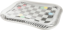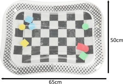 Entdecken Sie die kontrastreiche Wasser-Spielmatte, die nicht nur Ihr Kind fasziniert, sondern auch seine sensorische und motorische Entwicklung fördert. Diese Matte mit schwarz-weißem Schachbrettmuster enthält schwimmende bunte geometrische Formen, die sich bei Berührung des Kindes bewegen.