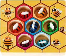 Bildungsspiel Bienenwabe Montessori unterstützt die Entwicklung motorischer Fähigkeiten und die Selbstständigkeit von Kindern. Es enthält eine Basis aus massivem Holz und sieben farbige Bienen, die mit der beigefügten roten Plastikpinzette in die entsprechenden Öffnungen eingesetzt werden.