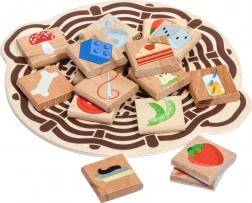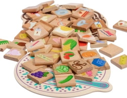 • 56 Holzplättchen mit farbigen Illustrationen von essbaren und nicht essbaren Gegenständen