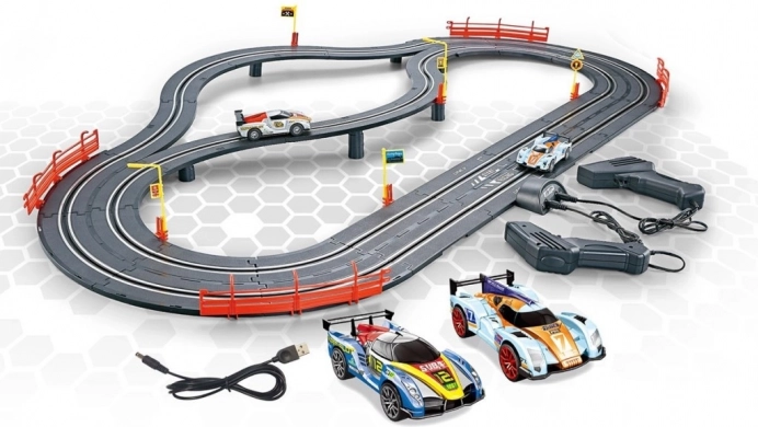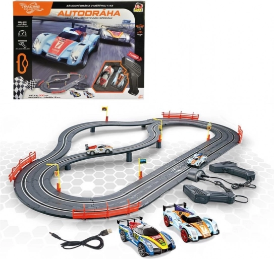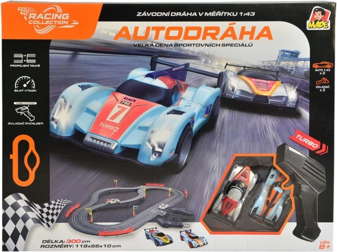 Im Lieferumfang enthalten sind zwei Rennwagen und zwei Handcontroller für sofortige Starts und präzise Geschwindigkeitskontrolle. Die Autorennbahn ist in einer tschechischen Box verpackt und eignet sich ideal als Geschenk für kleine und große Rennsportfans.